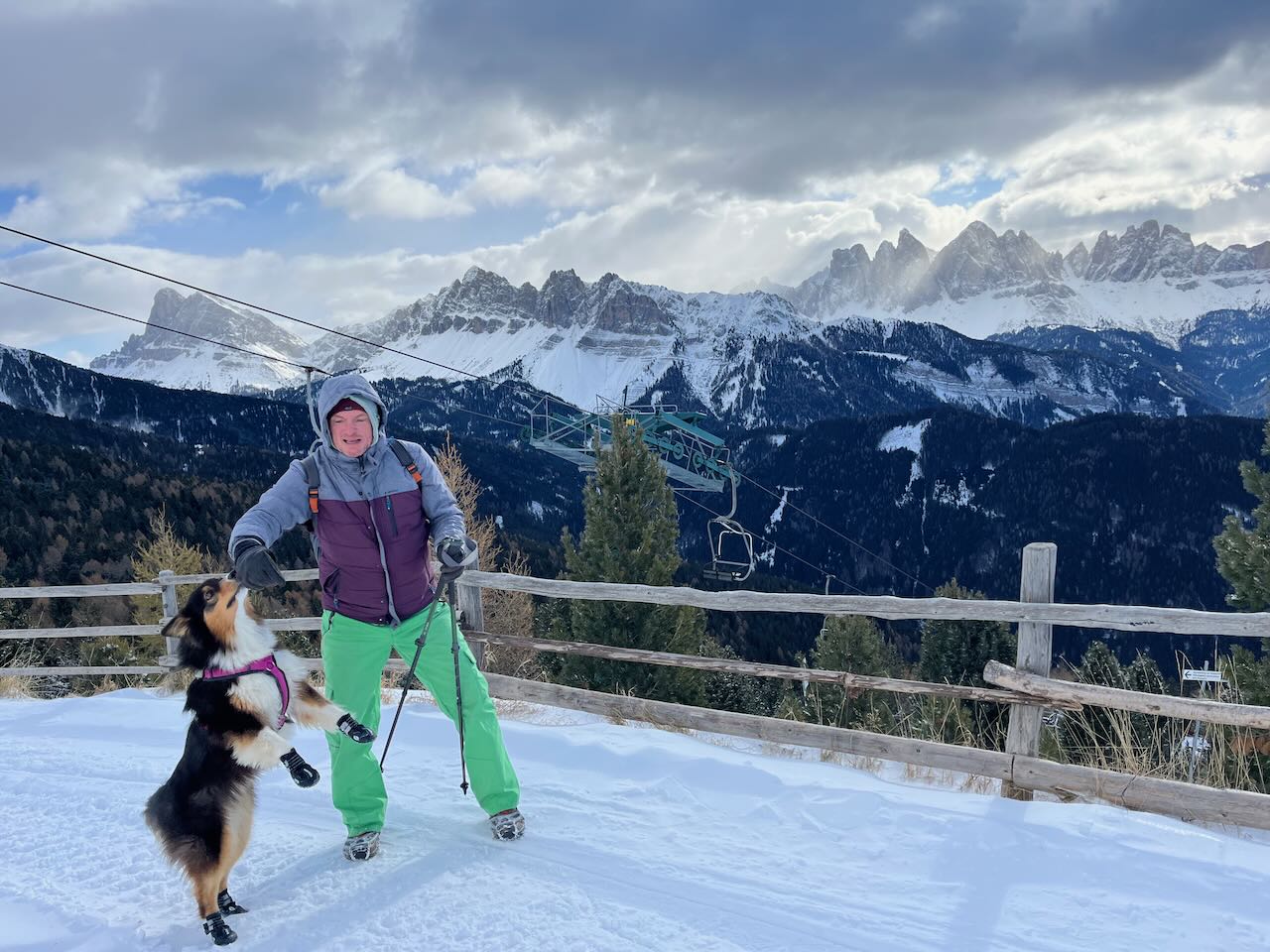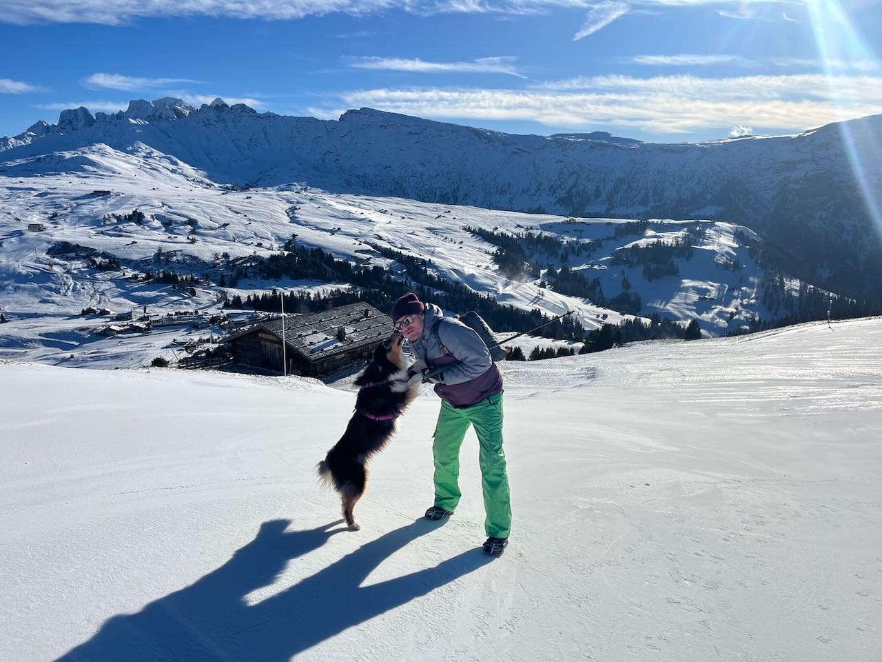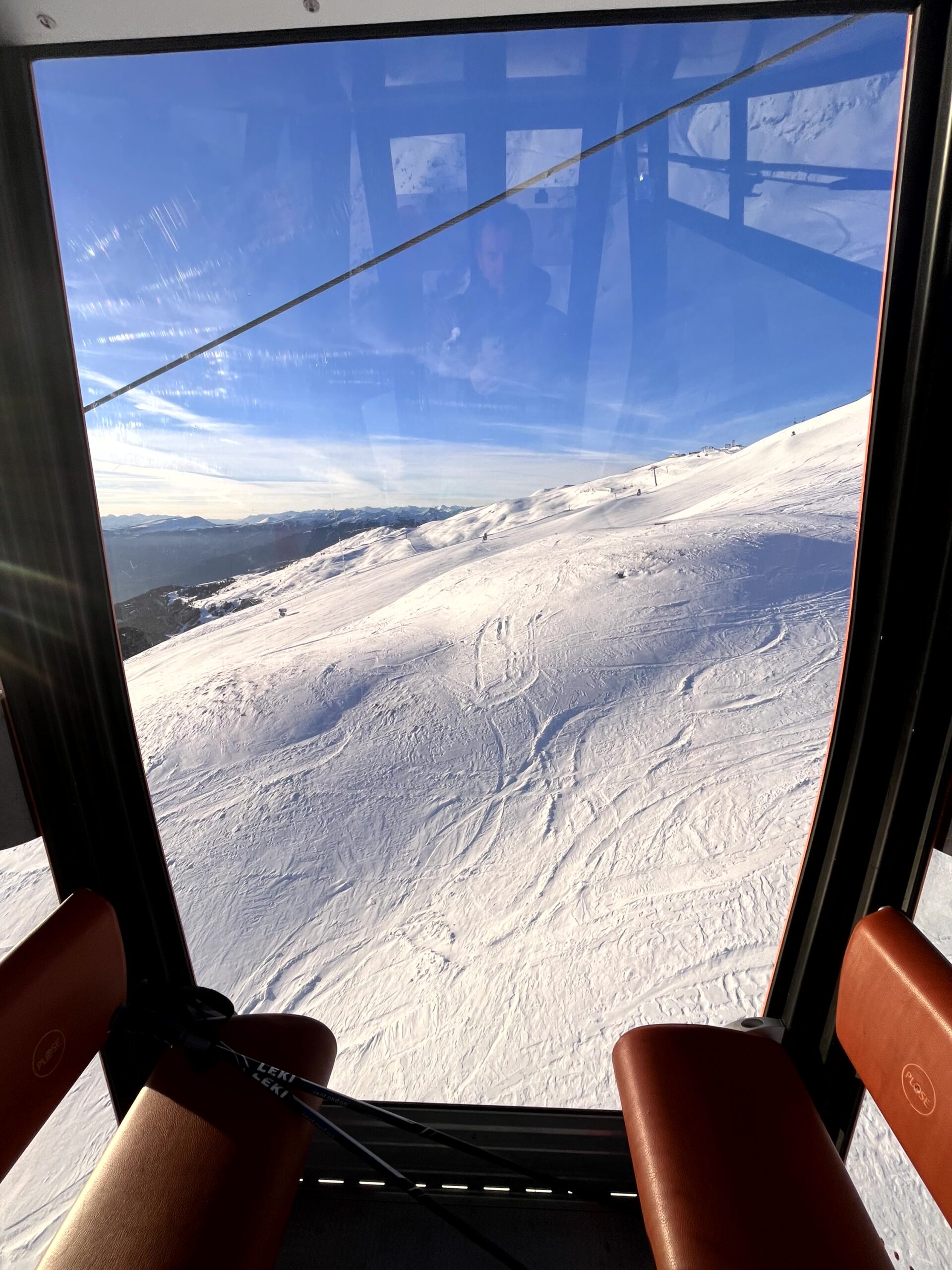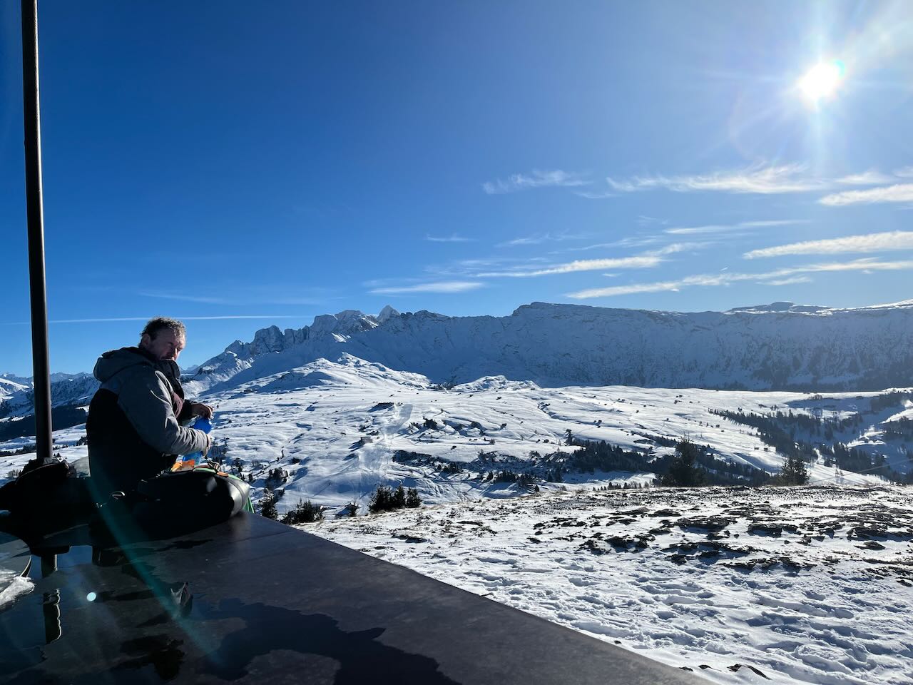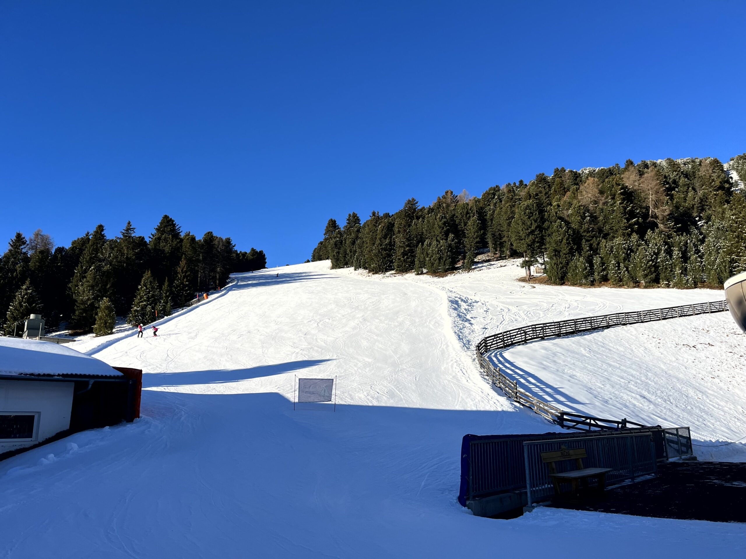 Also um 10 Uhr mit Skiausrüstung für Olaf raus aus dem Skiverleih, hoch mit der Gondel auf die Plose, den Wauwi natürlich im Schlepptau. Ich würde mir meine Snowboard-Ausrüstung später holen, wenn Olaf mich ablöst mit der Wauwi-Wache. Und was soll man sagen – da oben war fast niemand.. unglaublich.. frisch präparierte Pisten, strahlender Sonnenschein, königsblauer Himmel, nix los… Brandneue Liftanlage (sie waren sogar noch dabei, die letzten Arbeiten an der Außenanlage vorzunehmen). Ein paar Familien mit Kindern zum Rodeln und ein paar verstreute Skifahrer und Snowboarder.. sonst… nüschd! Die Pisten gehörten uns!