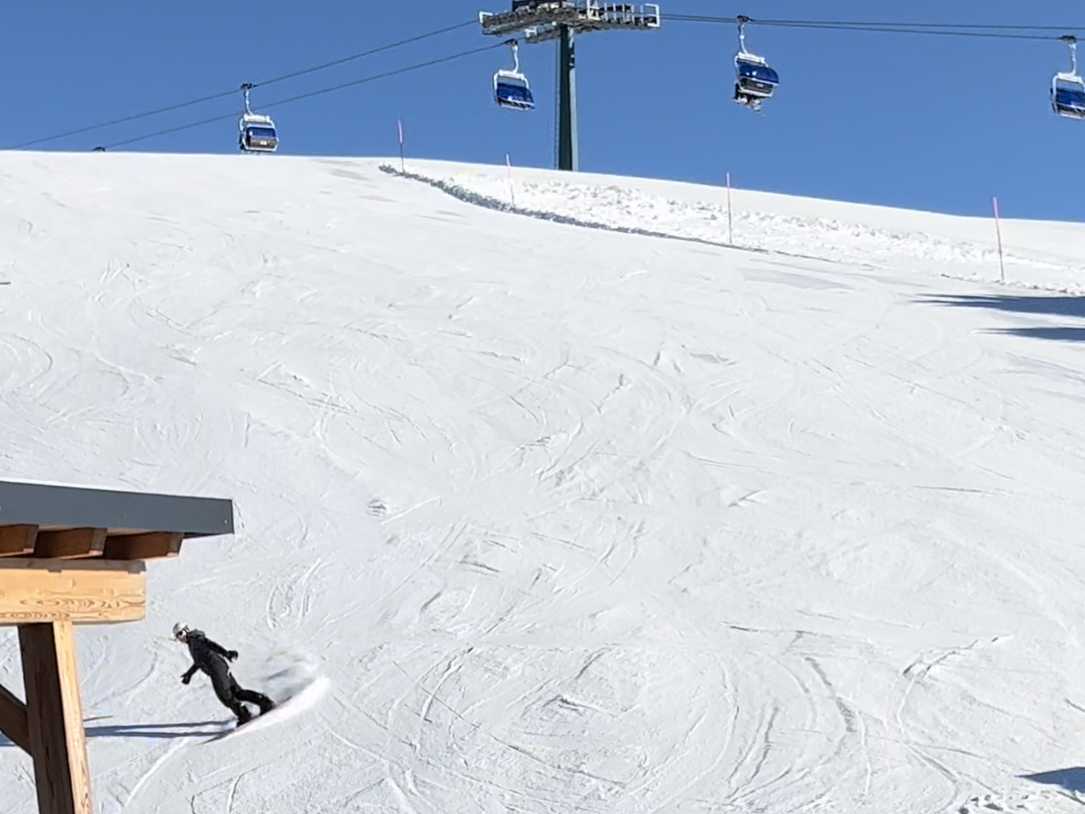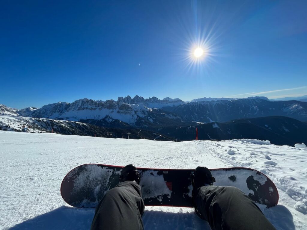 Als ich dann mit Wauwi und Ausrüstung zurück oben war, kam die Ablösung durch einen strahlenden, glücklichen Olaf, der sich mit dem Wauwi vor die Hütte in die Sonne setzte. Ich also los, runter zum Sessel und dann über absolut leere, traumhafte Pisten bei strahlendem Sonnenschein (und es war gar nicht kalt!) bis zum äußersten Winkel des Skigebiets, runter zum Schlemmer, von dort wieder hoch mit der Gondel und das Ganze wieder rückwärts zurück bis zur Plose. Aber leider hat mein blödes, vor Ewigkeiten (dank eines blöden, alten Sesselliftes) operiertes Knie von Anfang an totale Zicken gemacht. Jedes Mal, wenn ich im Lift oder auf der Piste saß oder mal kurz anhalten musste, zwickte und biss und riss es im Knie… das war nicht gut.. und tat weh… vielleicht ist dieses verdreht stehen auf dem Board inzwischen nicht mehr das Richtige für mich 🙁 Und so gut wie diesmal waren meine Knie und mein ganzer Körper noch nie vortrainiert für die Piste – durch die ganzen Wanderungen mit vielen Höhenmetern waren die Vorraussetzungen die Besten ever… AAAAAHHHHHRRRGHHHH