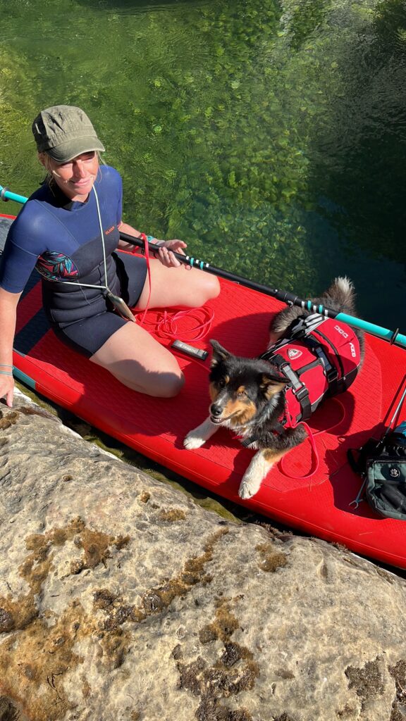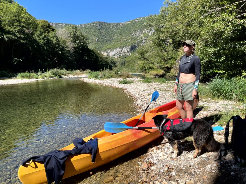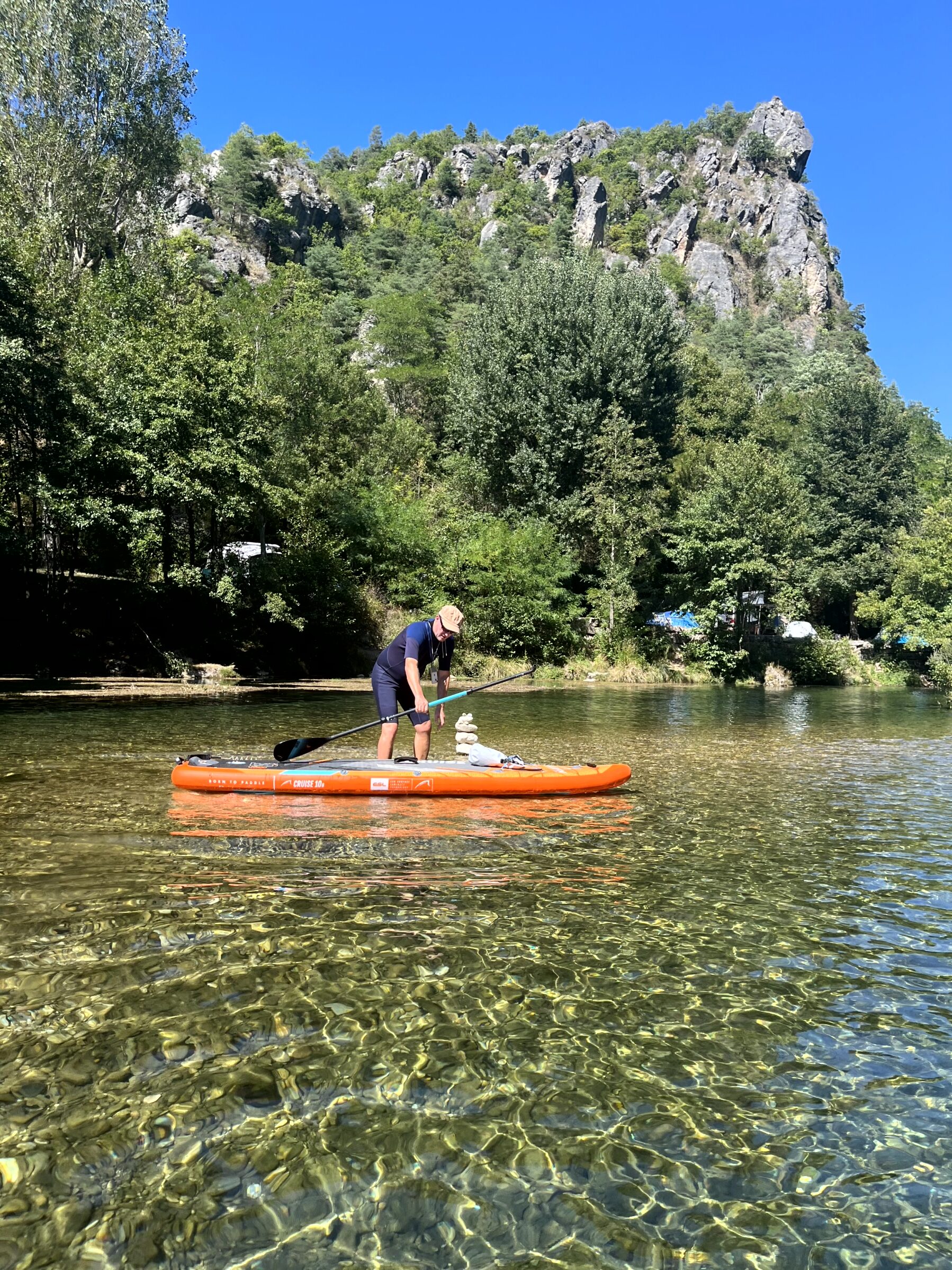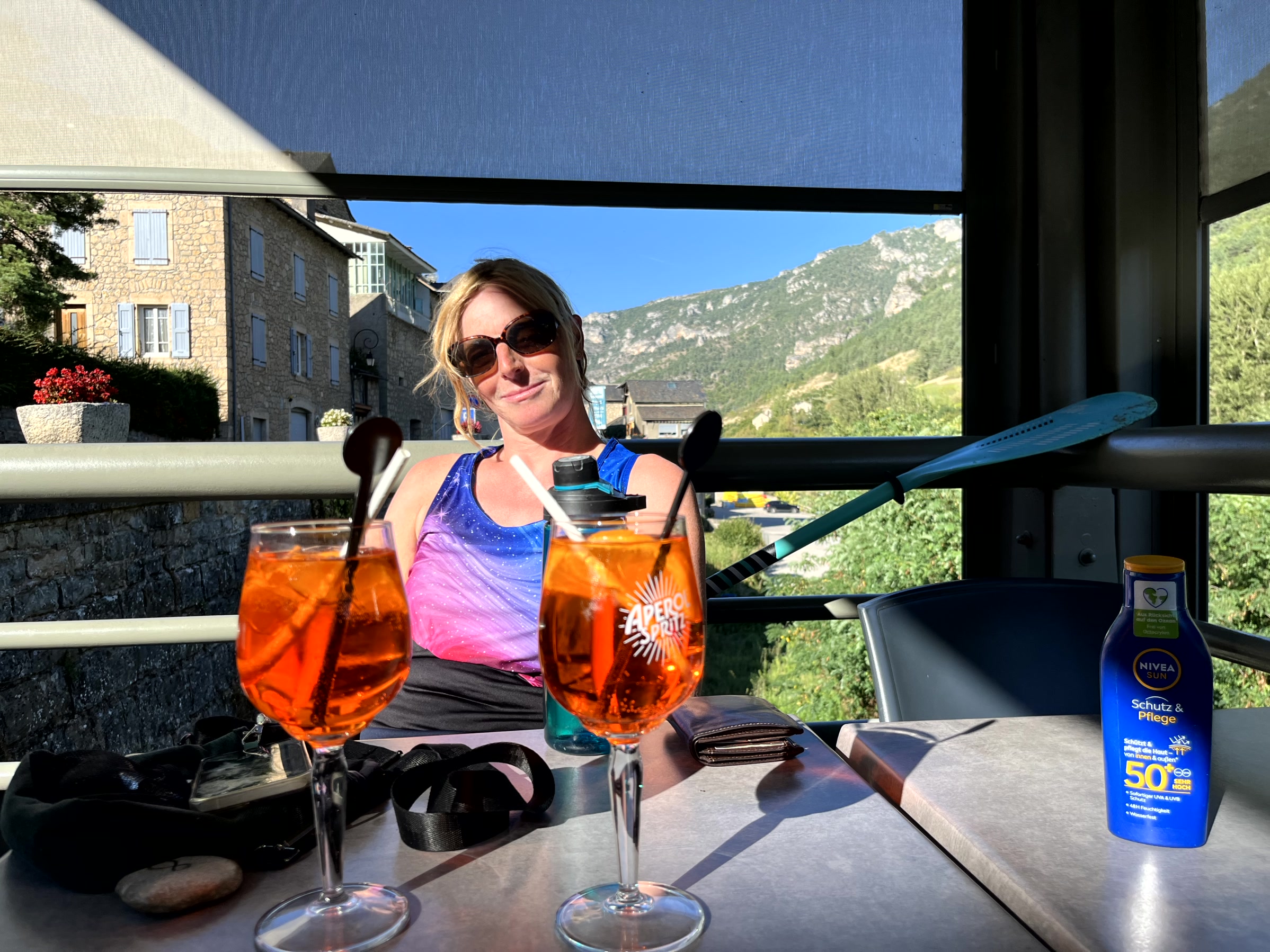 Ein paar lustige Videos und viel Geplantsche im 15 Grad kalten Wasser (wir sind seeehr glücklich über unsere kurzen Neoprenanzüge!!) später paddeln wir mit der Strömung zum nächsten Ort (Le Vignes), kaufen im Supermarkt ein paar Vorräte ein, trinken einen dringend benötigten Aperol und paddeln dann zurück zum Bulli.