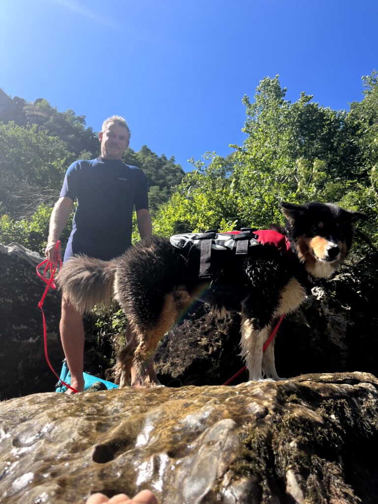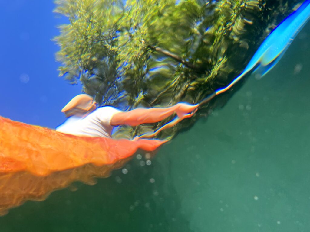 Am ersten Tag haben wir den Tarn flussaufwärts mit den SUPs erkundet. Spannend, da kommt der „Pas de Soucy“ – diejenigen mit Französisch-Kenntnissen werden sich wie ich wundern – was soll n das heißen, da ist doch eine Verneinung im Namen? Es heißt „Keine Sorge“. Hmmm wenn ich mir die vor vermutlich abertausenden von Jahren heruntergekrachten Felsmonster so ansehe, mache ich mir schon irgendwie Sorgen. Hier befindet sich die „Todesgefahr“-Zone des Tarn, wo man weder mit Kajak, Kanu oder SUP passieren kann und darf. Die Felsen liegen tief auf dem Wasser, es bilden sich sehr enge Stellen und gefährliche Strudel. Wir paddeln mit den SUPs an das südliche Ende dieses Bereichs heran, klettern auf einen Felsen, machen die SUPs fest und genießen das klare Wasser, die Strömung, die einerseits gut zum Schwimmtraining dient, andererseits einen gemütlich zurück zum Felsen trägt. Wir tauchen, erkunden, Olaf springt mehr oder weniger elegant vom Felsen und ich entdecke, dass man ja logischerweise mit einem wasserdichten Iphone wohl auch unter (Süß-)Wasser filmen und fotografieren kann. Wie geil ist das denn?! Warum auch immer, ich bin da noch nicht drauf gekommen, das mal auszuprobieren. Aber es funktioniert wahnsinnig gut. Schaut mal unten in die Fotos und Videos rein 😉