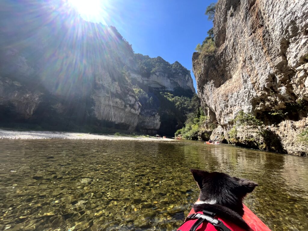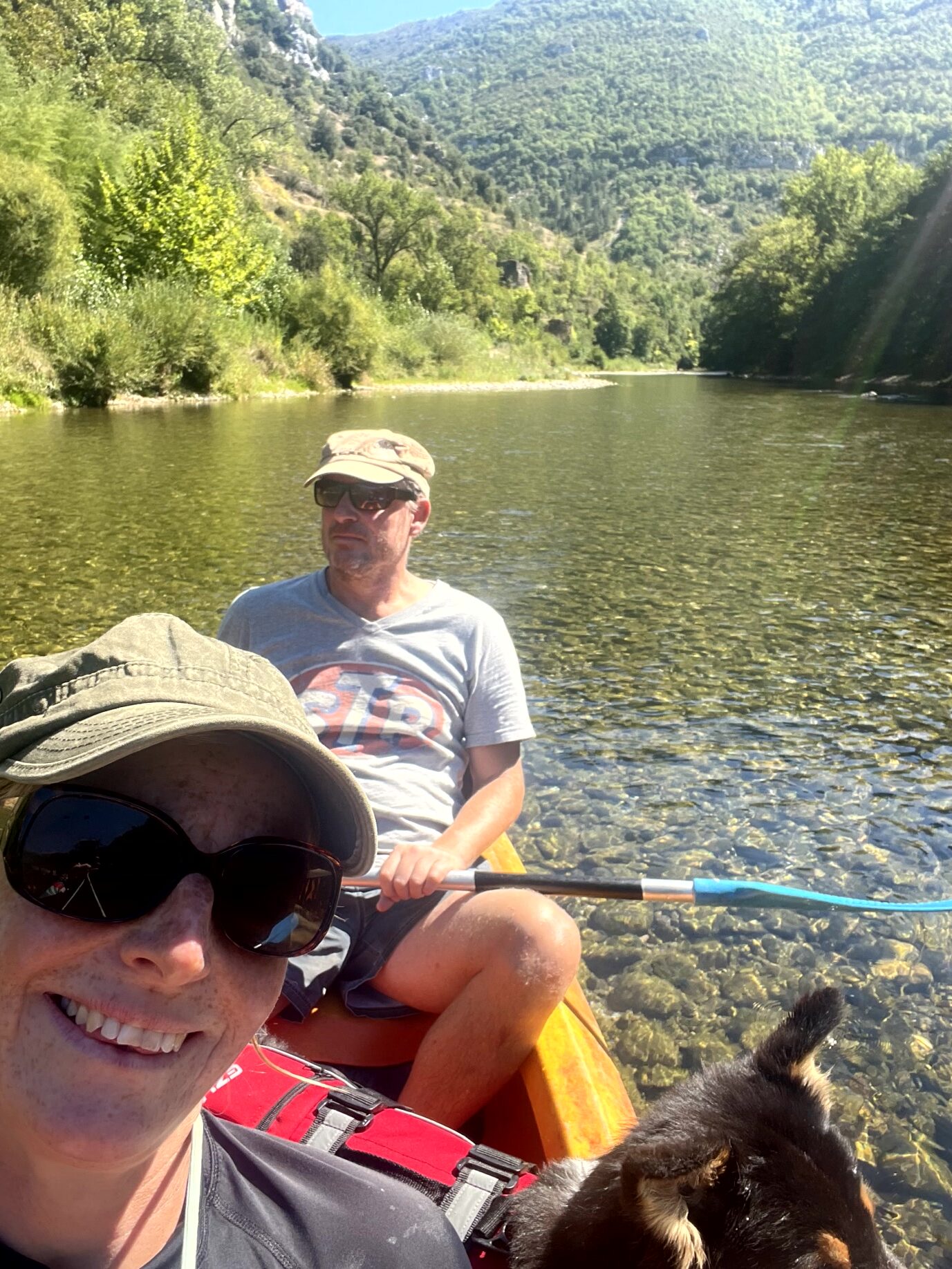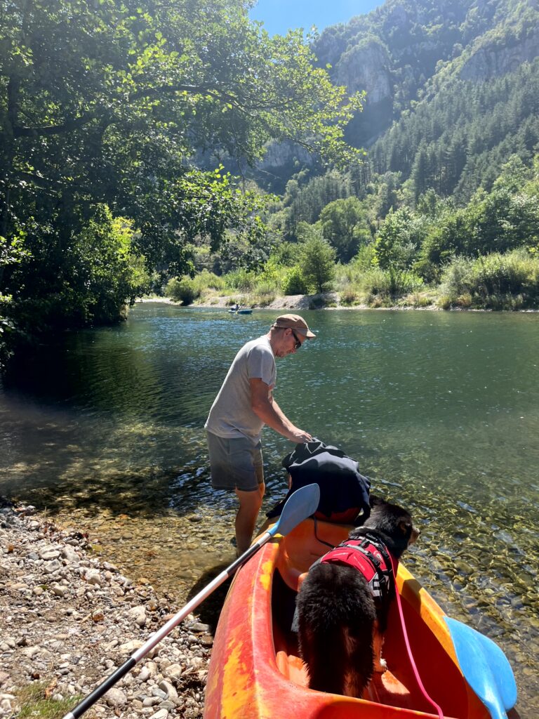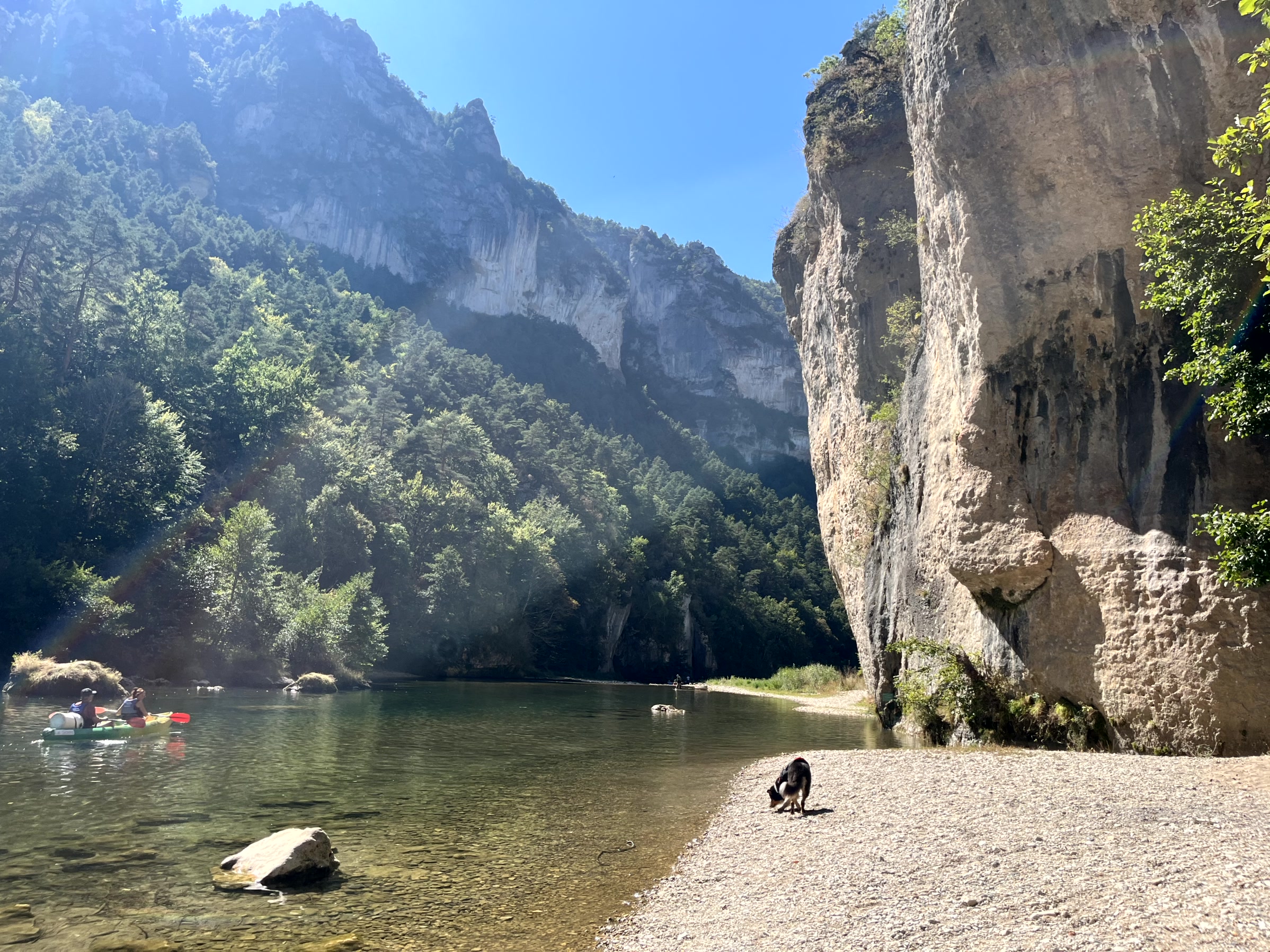 So – und last but not least, der 3. Tag – heute – eine lässige 11km lange Kanutour von La Malène bis zum Pas de Soucy. Auch hier wieder – was für eine tolle Natur, diese Felsen, die Geier, die weit über einem dahingleiten, das absolut klare Wasser, darin Fische bis zu 60cm Länge. Anhalten, baden, weiter, … gut, am Ende hatte die Tour ihre Längen.. allerdings auch, weil der Wasserstand schon etwas niedrig war, so dass die dicke Reisegesellschaft aus Olaf, Gina und mir doch ziemlich oft aufgesetzt oder steckengeblieben ist 😉