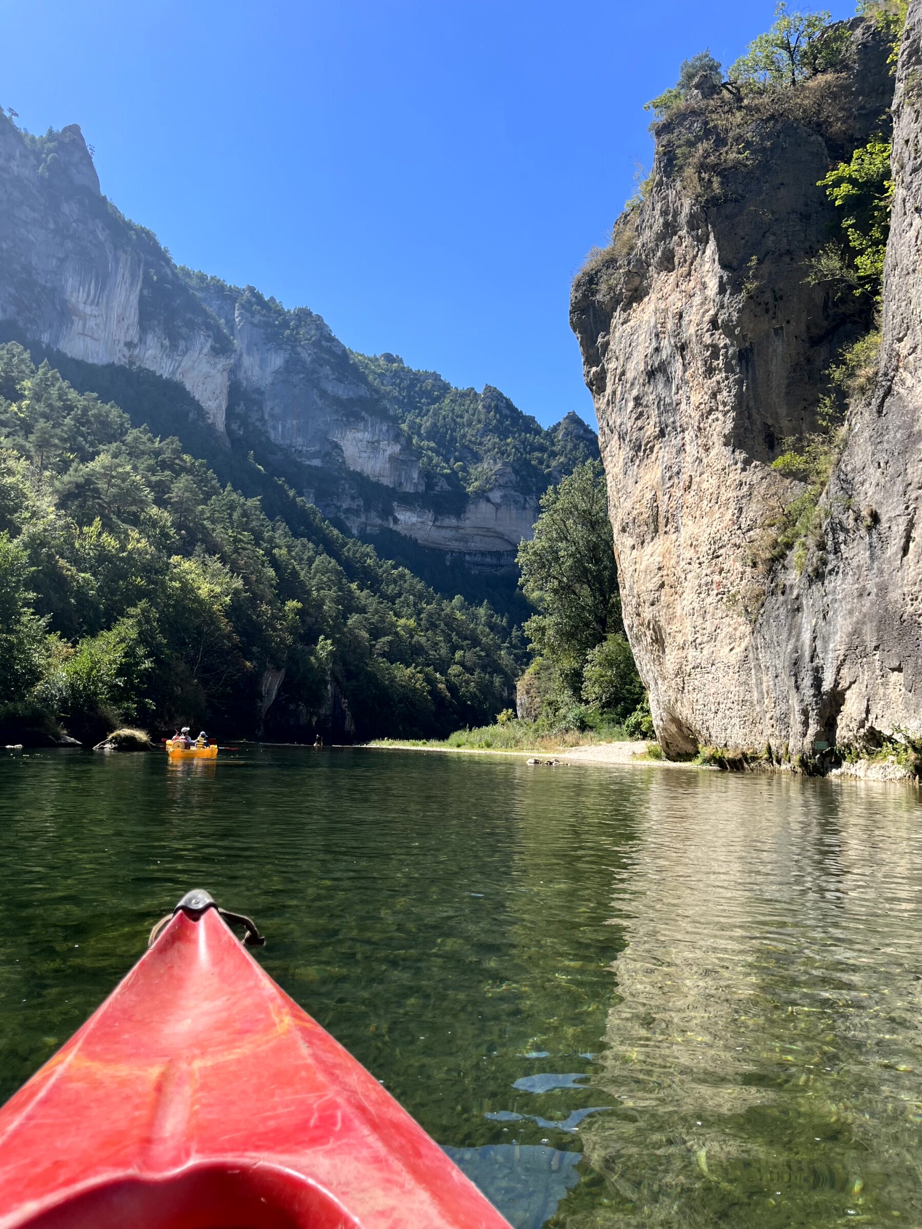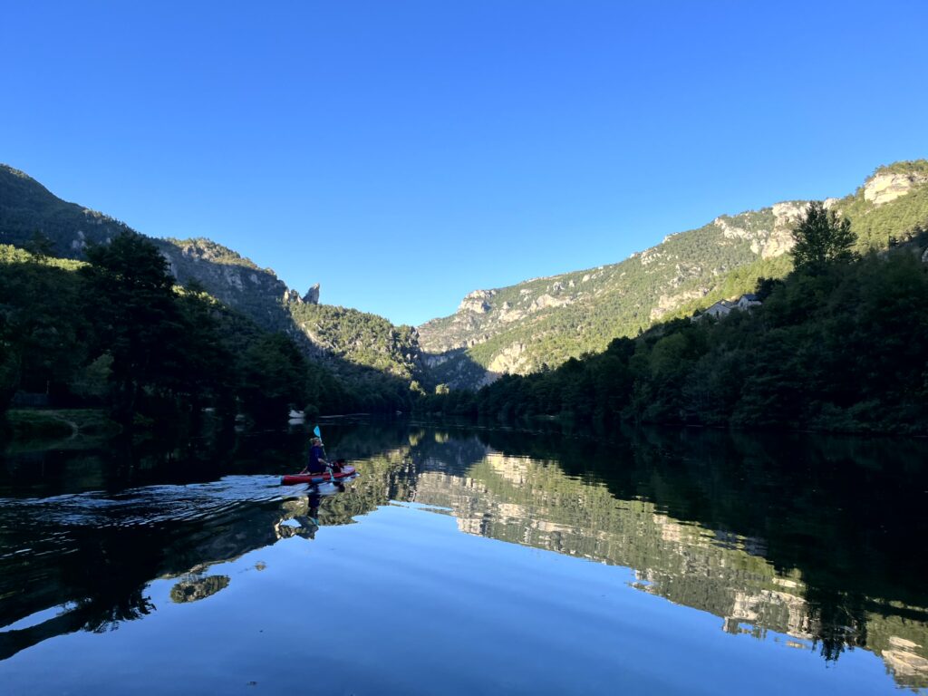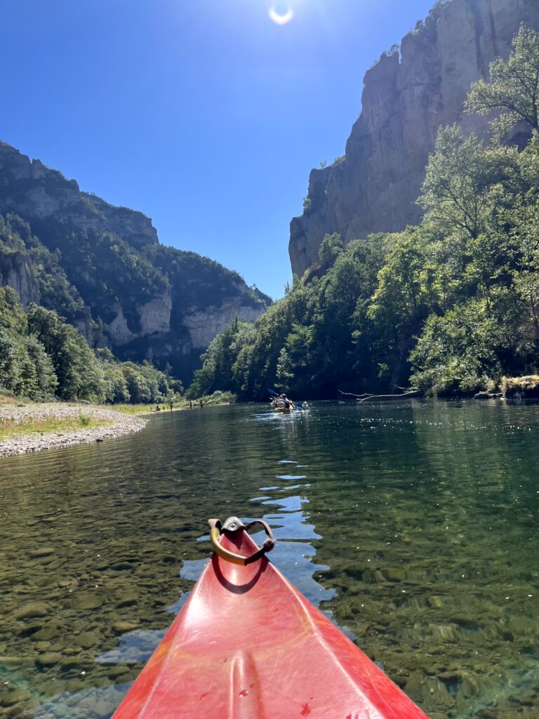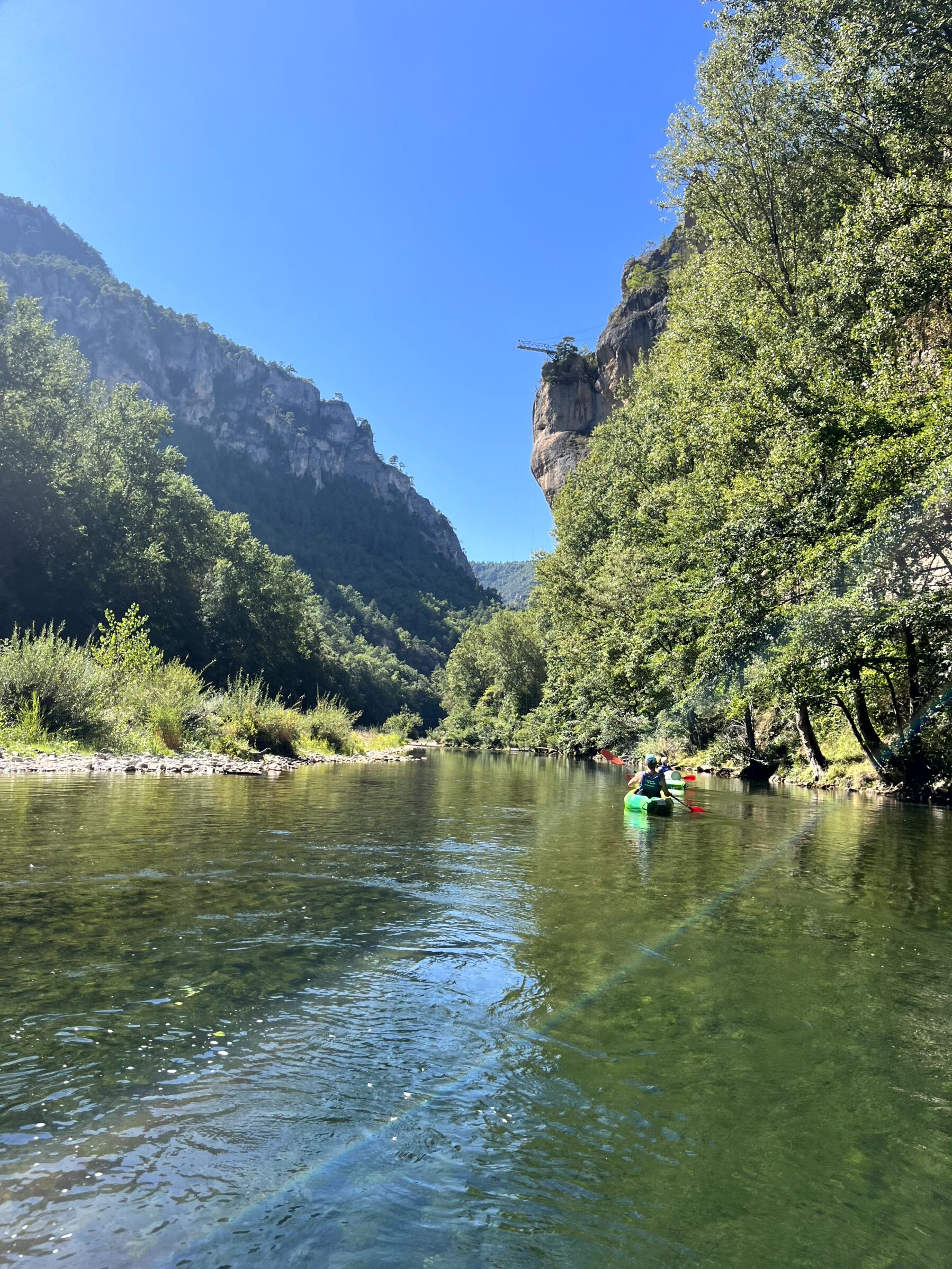 So – und last but not least, der 3. Tag – heute – eine lässige 11km lange Kanutour von La Malène bis zum Pas de Soucy. Auch hier wieder – was für eine tolle Natur, diese Felsen, die Geier, die weit über einem dahingleiten, das absolut klare Wasser, darin Fische bis zu 60cm Länge. Anhalten, baden, weiter, … gut, am Ende hatte die Tour ihre Längen.. allerdings auch, weil der Wasserstand schon etwas niedrig war, so dass die dicke Reisegesellschaft aus Olaf, Gina und mir doch ziemlich oft aufgesetzt oder steckengeblieben ist 😉