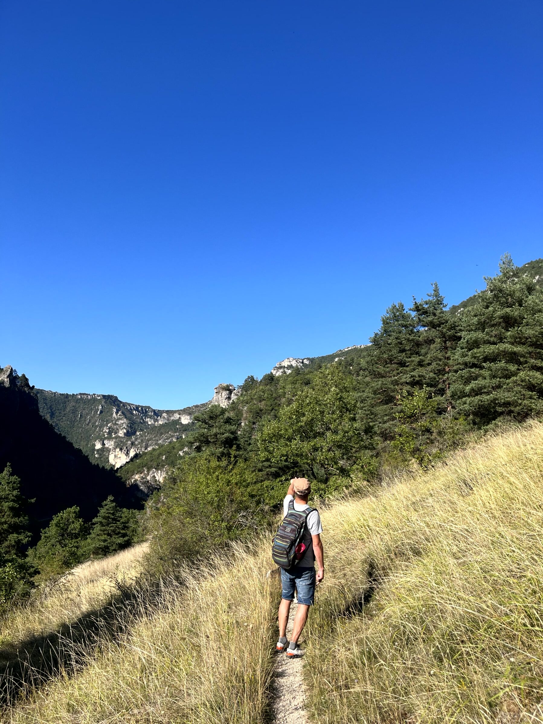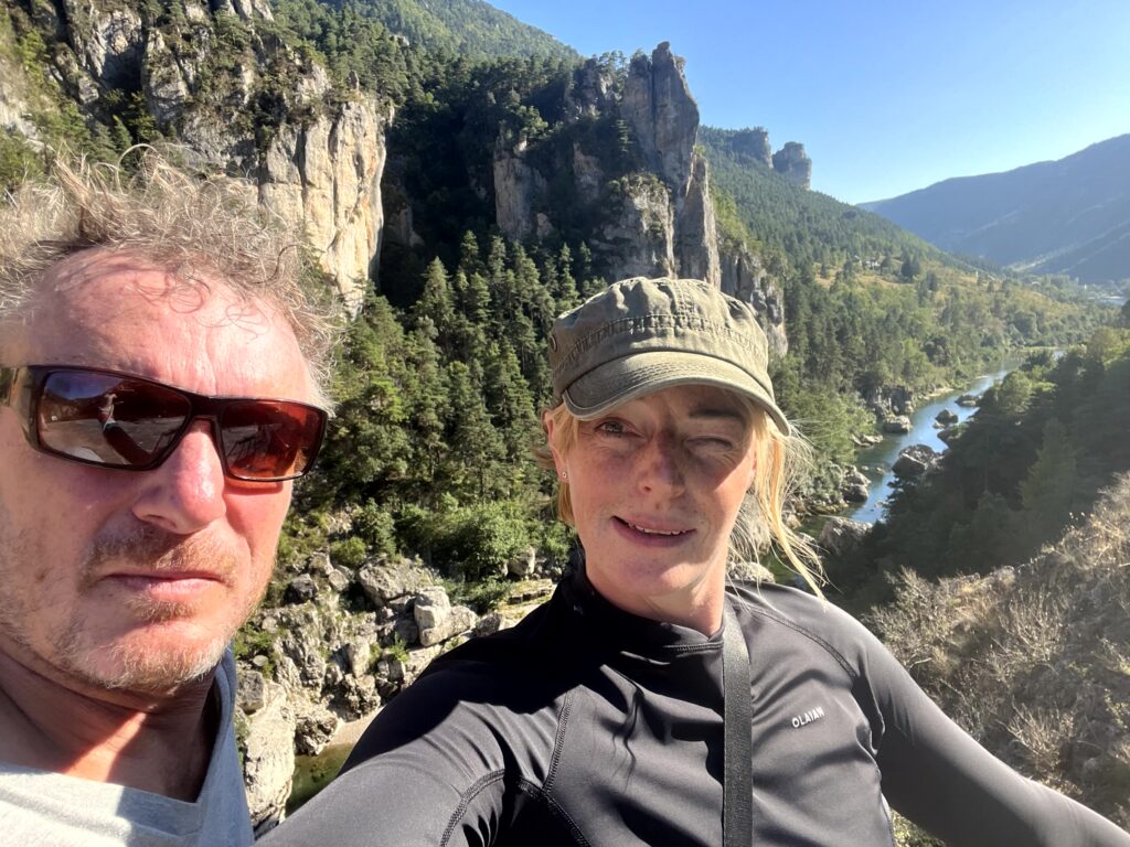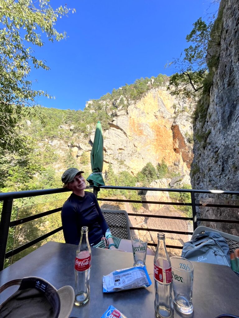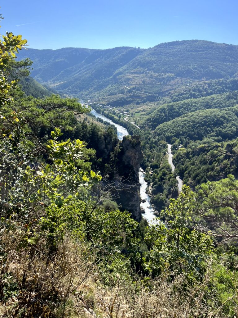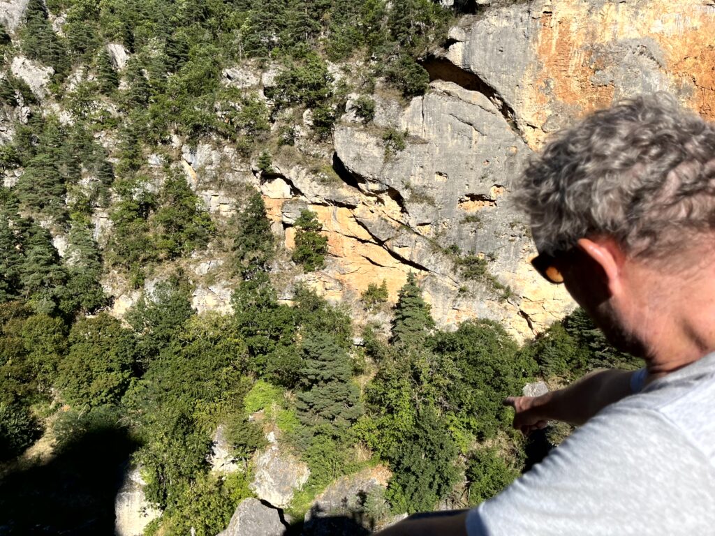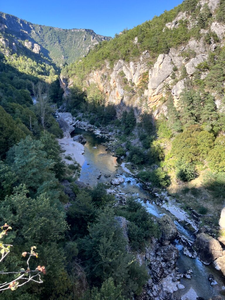 Am zweiten Tag haben wir eine schöne Wanderung unternommen. Es gab zwar keine machbaren Rundwege (alles ziemlich lang + steil, nix für über 30 Grad), aber wir sind durch Le Vignes rüber auf die andere Seite, den Berg insgesamt 150 Höhenmeter hochgewandert, wo man wohl Geier beobachten könnte. Und tatsächlich, hatten wir einerseits einen wahnsinnigen Blick auf das ganze Tal unter uns, sowie eine Menge Gänsegeier und wohl auch Steinadler über uns. Es war eine faszinierende Beobachtung, wie diese riesigen Geier (bis zu 2,80m Spannweite) weit über einem schweben. Der Rückweg führte uns dann hinunter bis an den Tarn, wo wir genau gegenüber unseres Stellplatzes ans Ufer kamen. Ab in die Badeklamotten, die Rucksäcke geschultert und rein ins kühle Nass, zu unserem Stellplatz… herrlich erfrischend, nach so einer Tour!