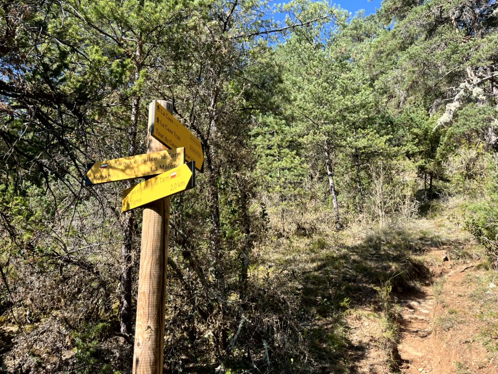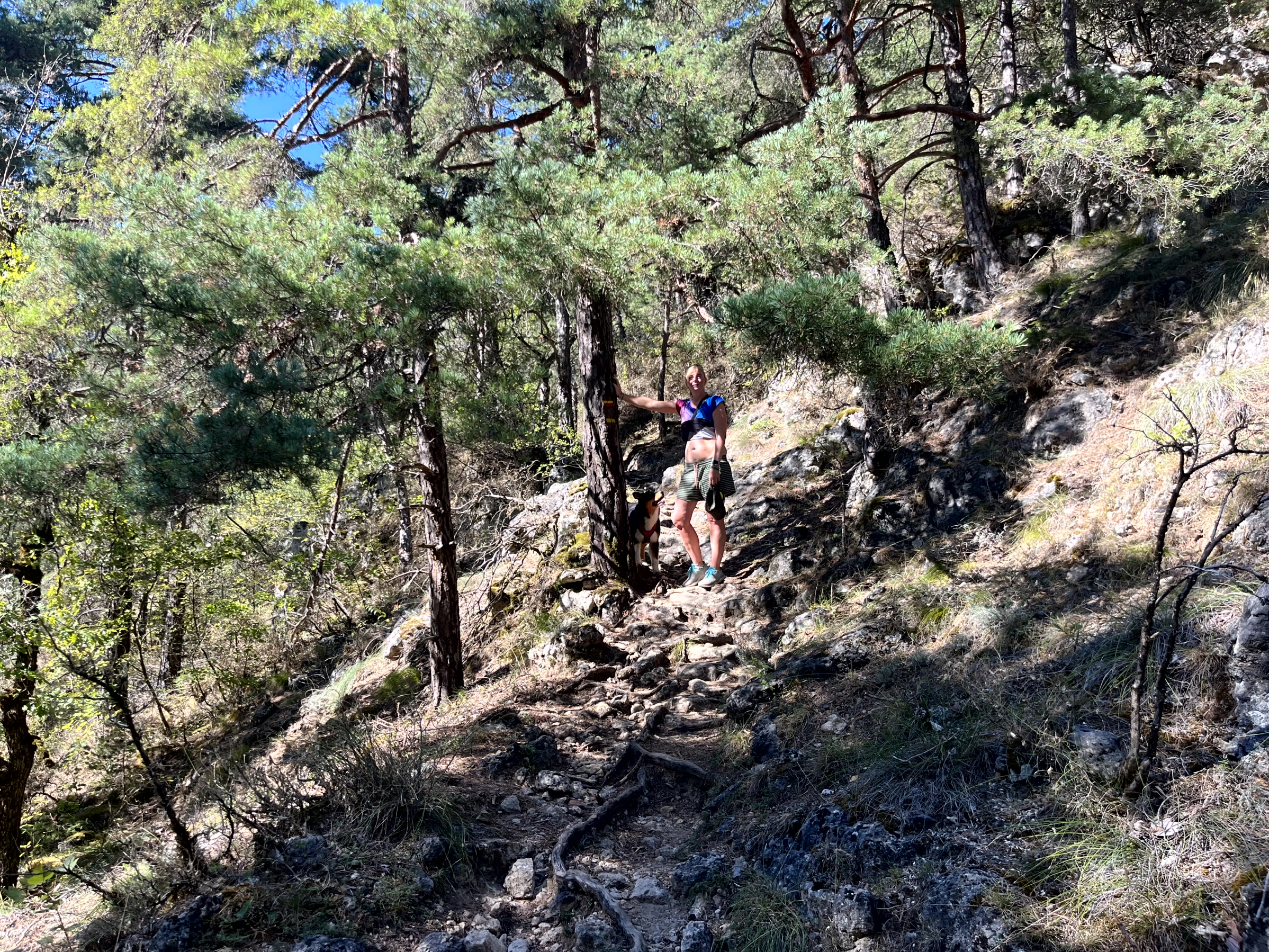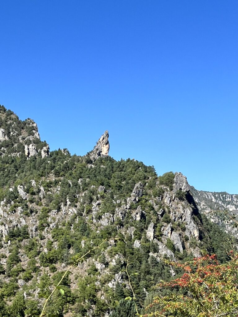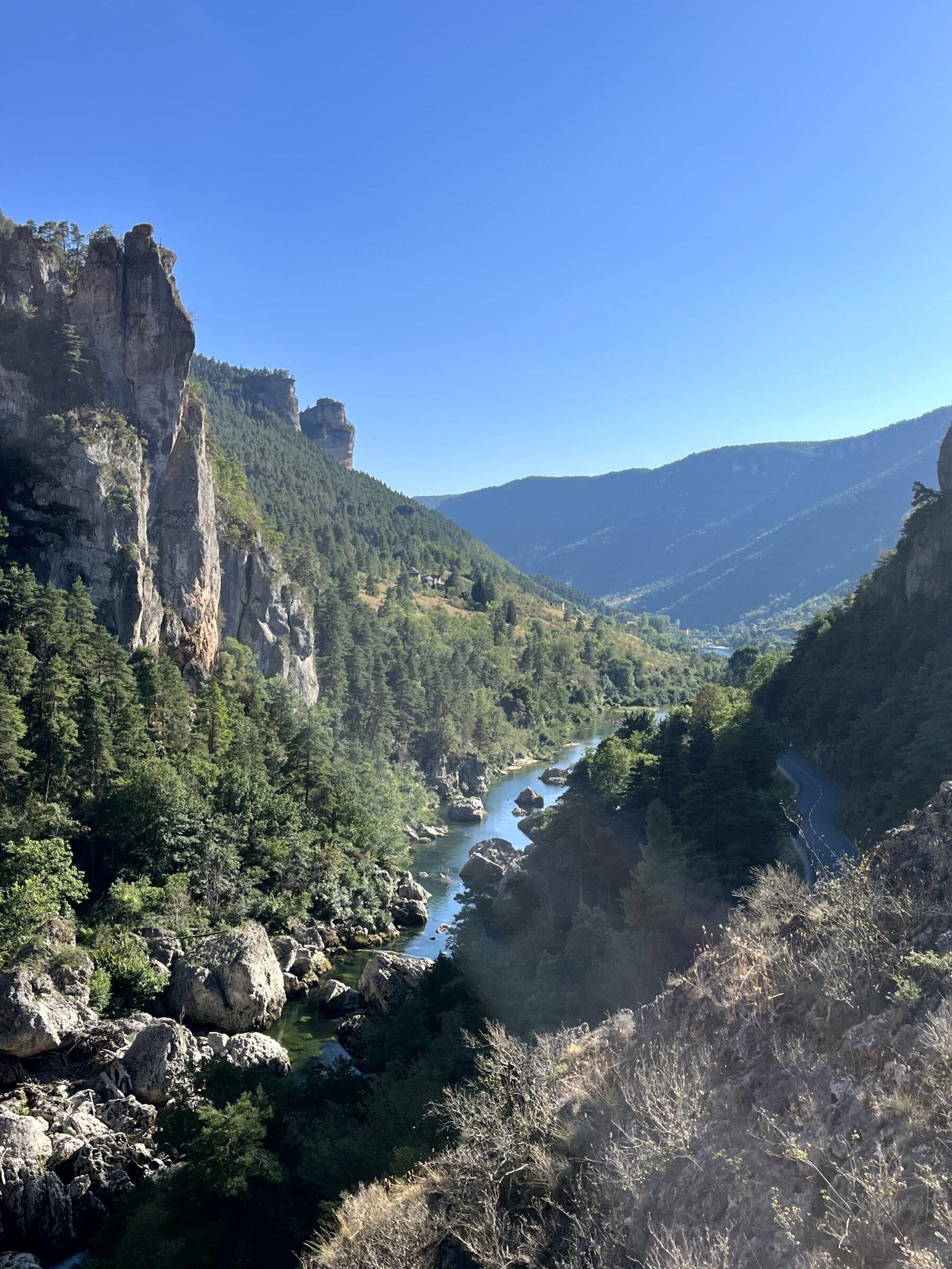 Am zweiten Tag haben wir eine schöne Wanderung unternommen. Es gab zwar keine machbaren Rundwege (alles ziemlich lang + steil, nix für über 30 Grad), aber wir sind durch Le Vignes rüber auf die andere Seite, den Berg insgesamt 150 Höhenmeter hochgewandert, wo man wohl Geier beobachten könnte. Und tatsächlich, hatten wir einerseits einen wahnsinnigen Blick auf das ganze Tal unter uns, sowie eine Menge Gänsegeier und wohl auch Steinadler über uns. Es war eine faszinierende Beobachtung, wie diese riesigen Geier (bis zu 2,80m Spannweite) weit über einem schweben. Der Rückweg führte uns dann hinunter bis an den Tarn, wo wir genau gegenüber unseres Stellplatzes ans Ufer kamen. Ab in die Badeklamotten, die Rucksäcke geschultert und rein ins kühle Nass, zu unserem Stellplatz… herrlich erfrischend, nach so einer Tour!