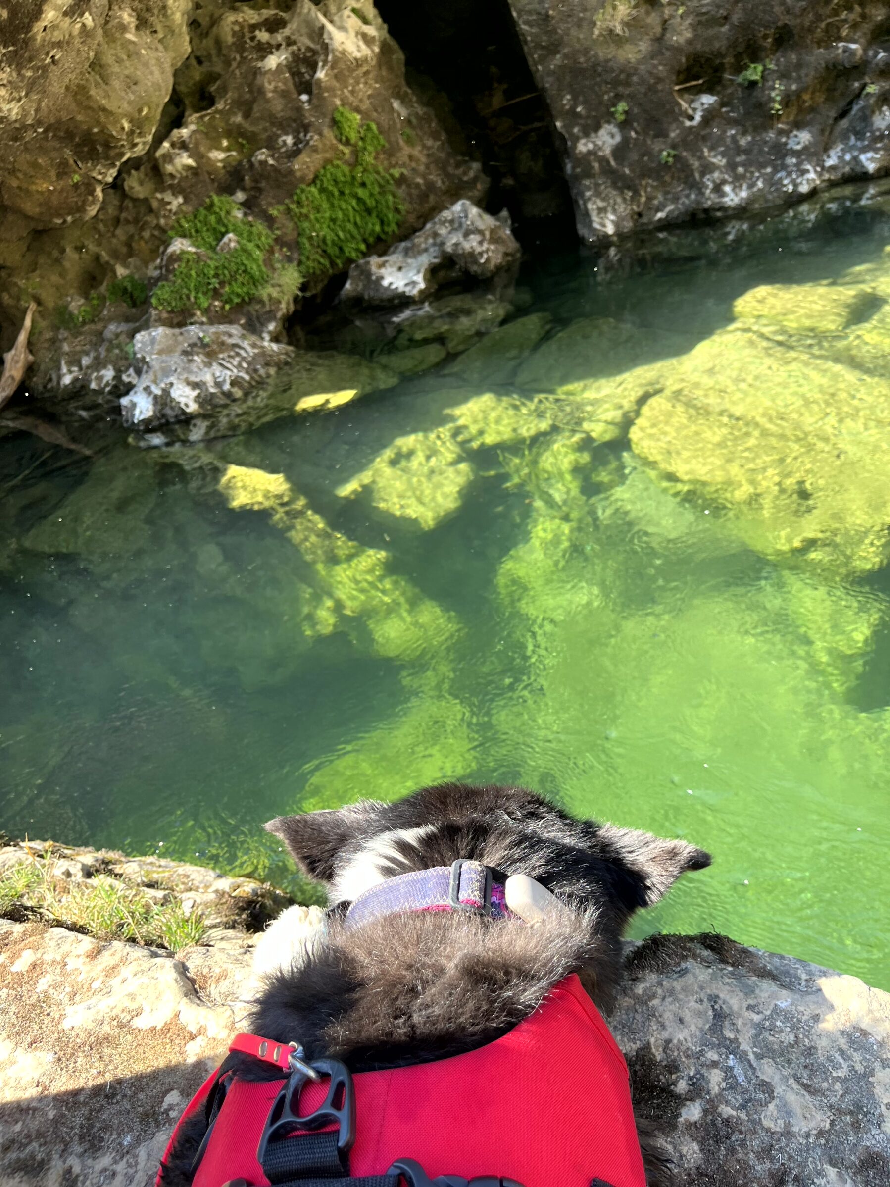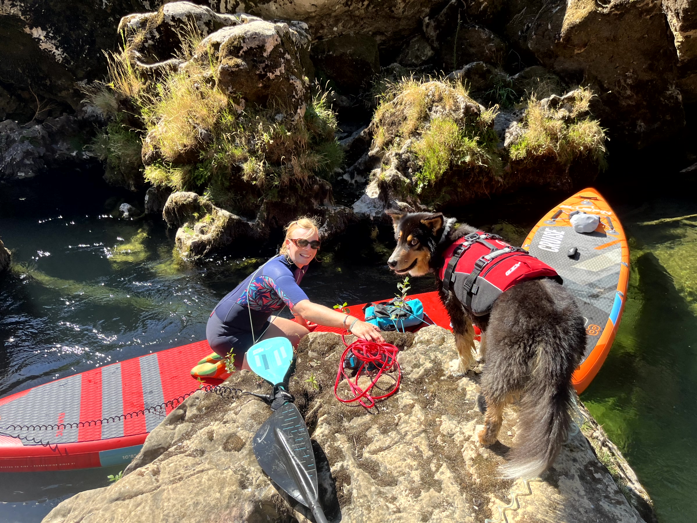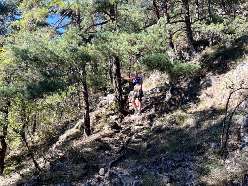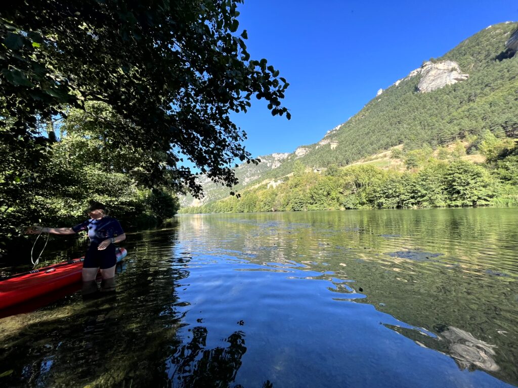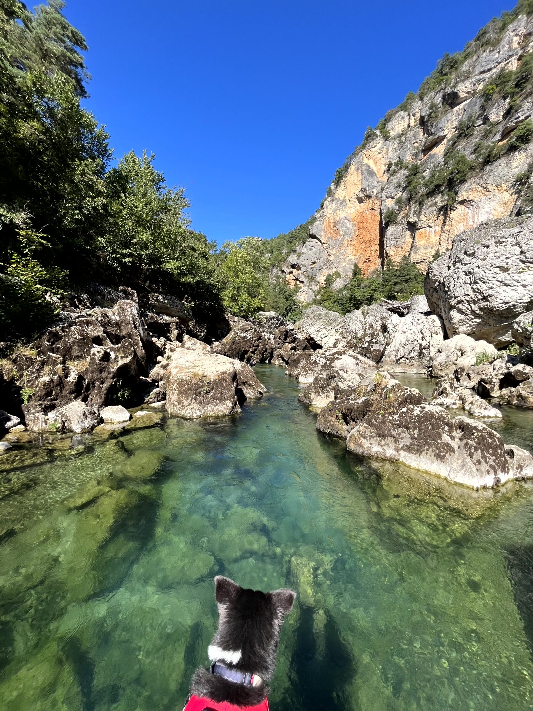 Am nächsten Morgen allerdings wurden wir reichlich belohnt. Spätestens, seit um 10 Uhr die Sonne im Tal ankam, kommen wir aus dem Staunen nicht mehr heraus. Wow, was für eine wahnsinnig schöne Schlucht! Das Wasser ist glasklar, überall sind schroffe Felsen zu sehen, die Unterwasserwelt ist auch schön vom SUP oder Kanu aus zu beobachten. Und – wir waren uns erst nicht sicher, aber haben nachgelesen und -gefragt: Hier gibt es noch Geier! Oben in den schroffen, steilen Felsen wohnt eine Gänsegeierfamilie mit 8 Jungen sowie 2 Steinadler. Und wir haben sie wohl inzwischen alle gesehen.