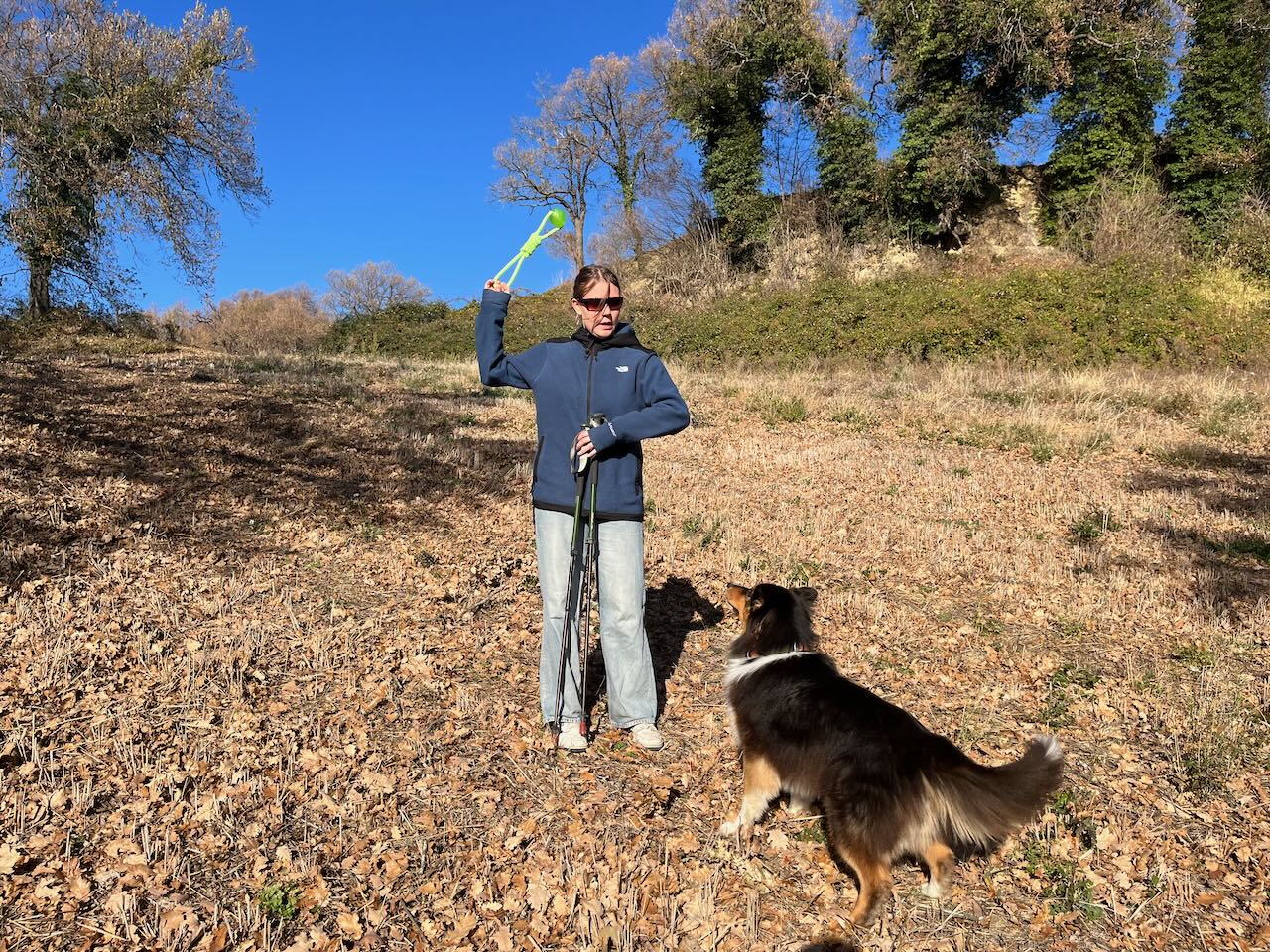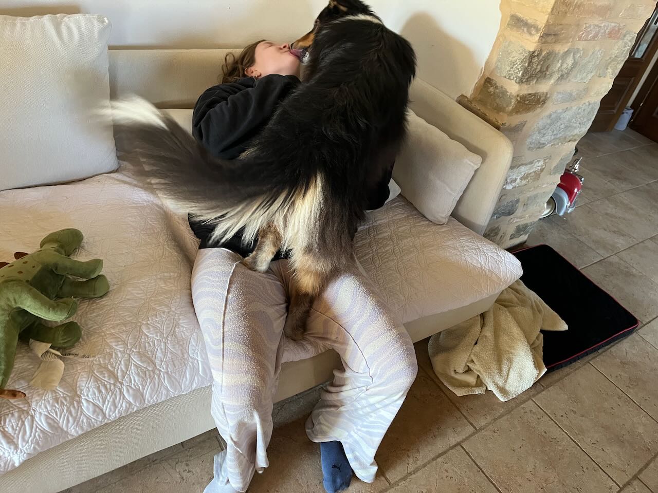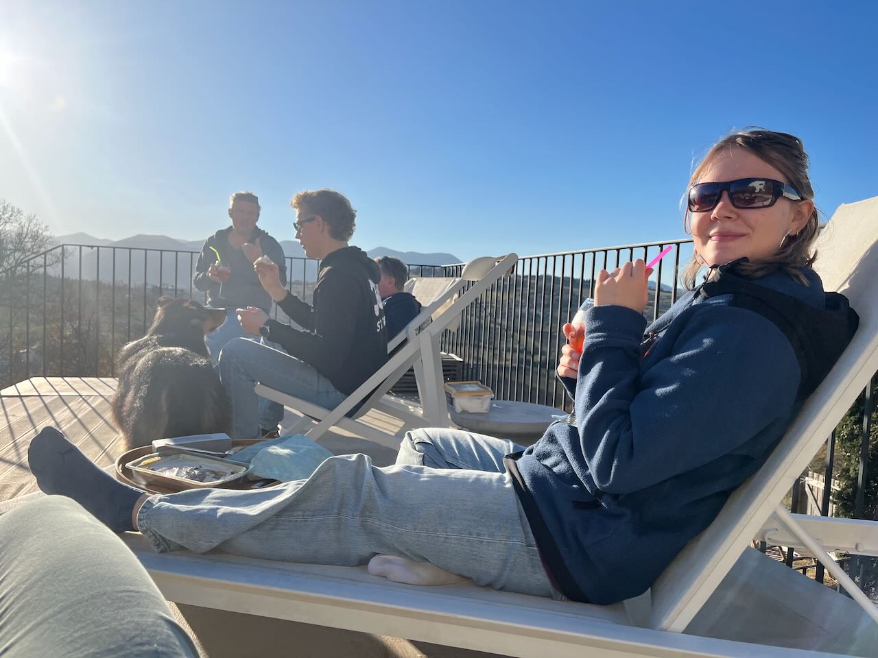 Dafür hatten wir dann heute wieder so einen richtig fetten Tag. Die Sonne knallte aus allen Knopflöchern und es war windstill. Zwar hatten wir wohl nur so 6-7 Grad, aber auf der Süd-Ost-Seite des Hauses, am großen Tisch vor der Küche, konnten wir wieder im Pullover sitzen, gemütlich und ausgiebig frühstücken, dazu ein kleines Sektchen, was soll der Geiz, und haben Quatsch geredet und Tränen gelacht. Eine Runde Crocket, bei der Sophie („Ich hab das das letzte Mal mit 5 Jahren gespielt“) uns volles Rohr abgezogen hat, eine Gassirunde den Hang runter, danach am Pool in der Sonne auf den Liegen chillen, dem Poolboy (Olaf) beim Pool säubern zusehen, mit kalter Coke und Salzkram bedient werden – ebenfalls vom Poolboy .. och, das hätte eigentlich so weitergehen können…