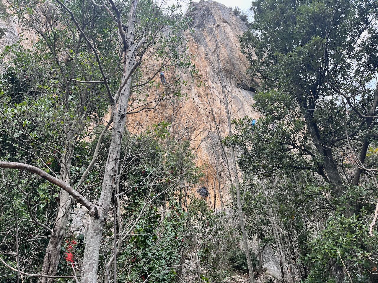 Die Wanderung führte uns diesmal einen Schlenker weiter und in eine kleine Schlucht, an der die alten Herren dann doch lieber Stopp machten und ein Pläuschchen halten wollten, während Nina, Tommi, Gina und ich den schmalen Pfad (rechts gings recht steil runter, nix für alte Herren mit Höhenangst 😉 ) weiter kletterten und unten in der Schlucht dann eine Menge Leute trafen, die eine Klippe hinaufkletterten. Wow. Und alle ohne Helm. Idioten. War faszinierend mit anzusehen, aber ich war ganz froh, dass ich nur zugucken musste 😉