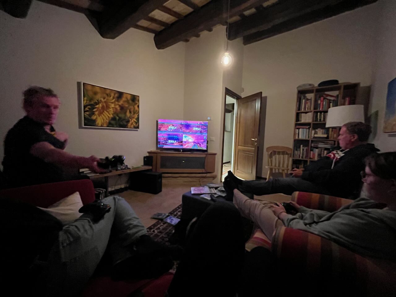 Wir sind es – herrlich entspannt, mit Nina, Tommi und Dahibi (Hübi) in der Casa Amici, mit lecker selbstgemachter Pizza, Sonic auf der Xbox spielen und dem Feuerwerk auf dem Berg gegenüber zuschauen, am Pool, mit einem Sektchen in der Hand. Herrlich dekadent.
