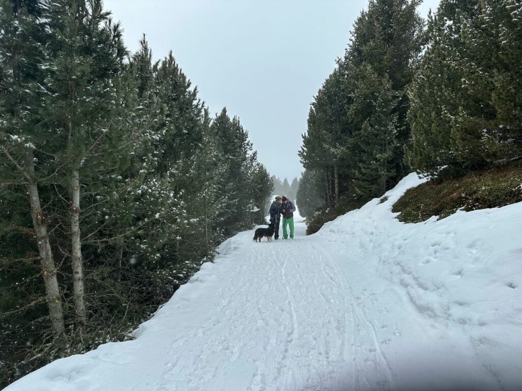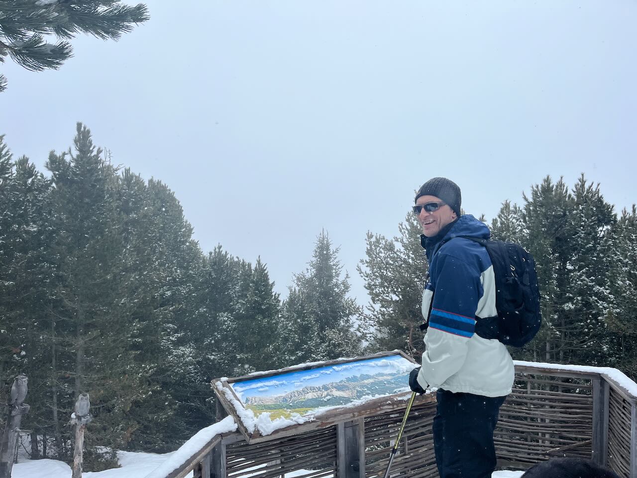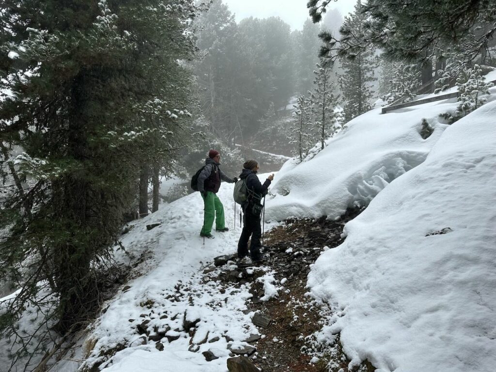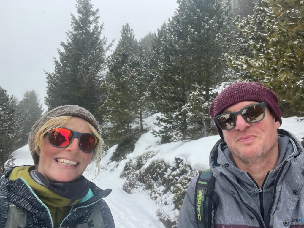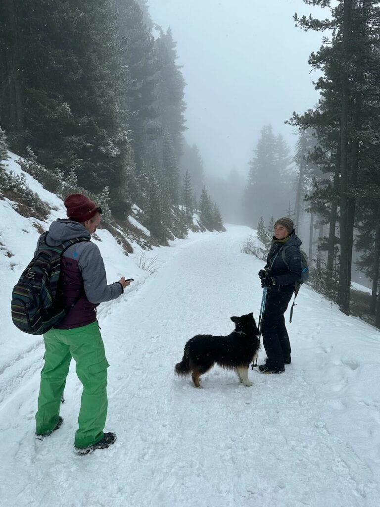 Dafür gab es aber natürlich oben schön Neuschnee und wir haben halt die Wanderung mit Kai auf 2000m hochverlegt und sind dort mit ihm durch Nebel und Schnee gewandert. Spikes an den Füßen, Wanderstöcke und dann 10 Kilometer von Hütte zu Hütte bei Schneefall. Lumumba, Radler, Kaiserschmarrn, Klöße in Gulaschsuppe.. Lecker!! Die Stimmung war der Hammer – mit leise rieselt der Schnee durch den Wald wandern, teilweise ohne Sicht, und Kai war überglücklich, mal die nervigen Kids ein paar Tage loszusein 😅