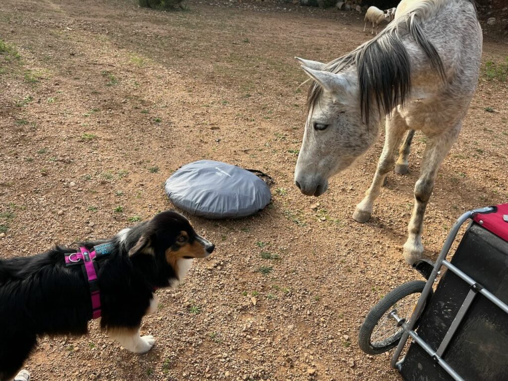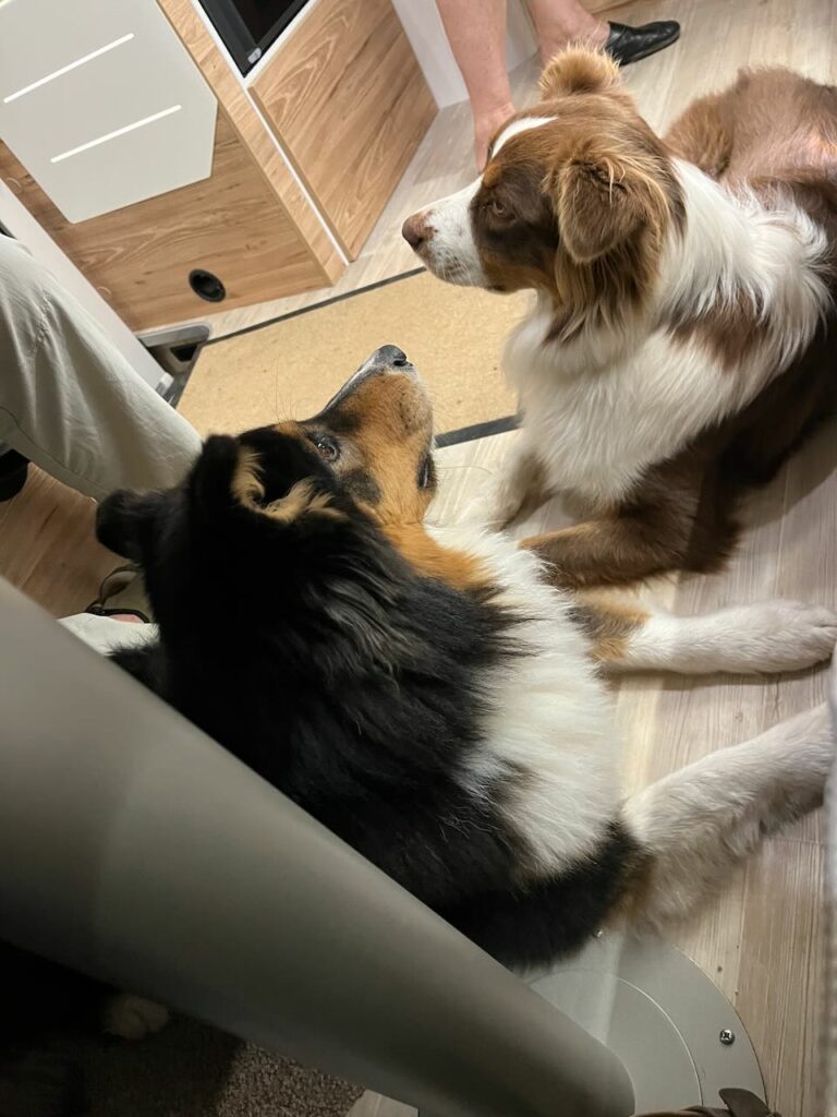 Die beiden hatten auch eine Australien-Shepherd-Hündin dabei – Shoop, ein Jahr alt und natürlich entsprechend verspielt. Was Gina nicht so interessierte. Gina musste sie nur immer anmeckern, egal was sie tat. Erst nach zwei Tagen ließ Gina sich auf ein Spiel mit Shoop ein..