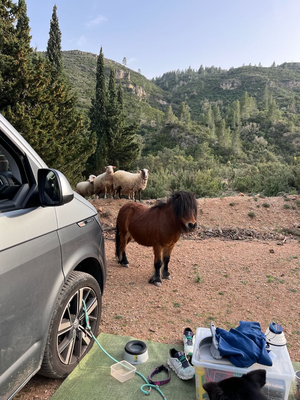 Nein, keine doofen Camper, sondern die freilaufenden Schafe, ein Pony und ein Pferd. Die Schimmelstute war von den Schafen anscheinend auch anhand der Fellfarbe zum Schaf-Chef auserkoren, und so rannten die sechs Schafe immer wie magnetisch hinter dem Pferdchen hinterher. Zu Ginas Freude schienen die Schafe auch genau zu wissen, was so ein Hütehund Jobtechnisch tut.. und so musste ich Gina erstmal eine halbe Stunde davon abhalten, die Schafe zu hüten, bis sie sich endlich beruhigt hatte.
