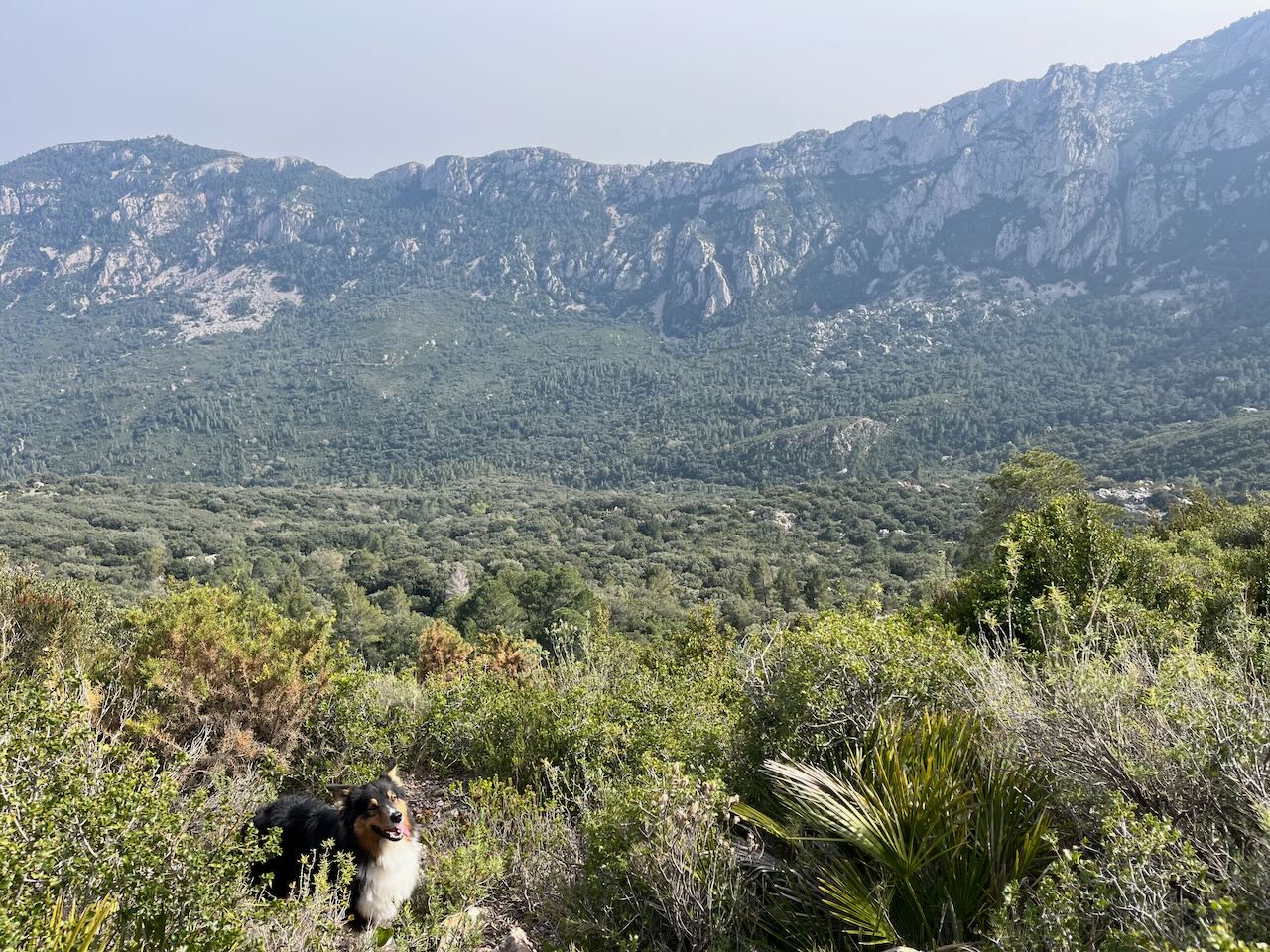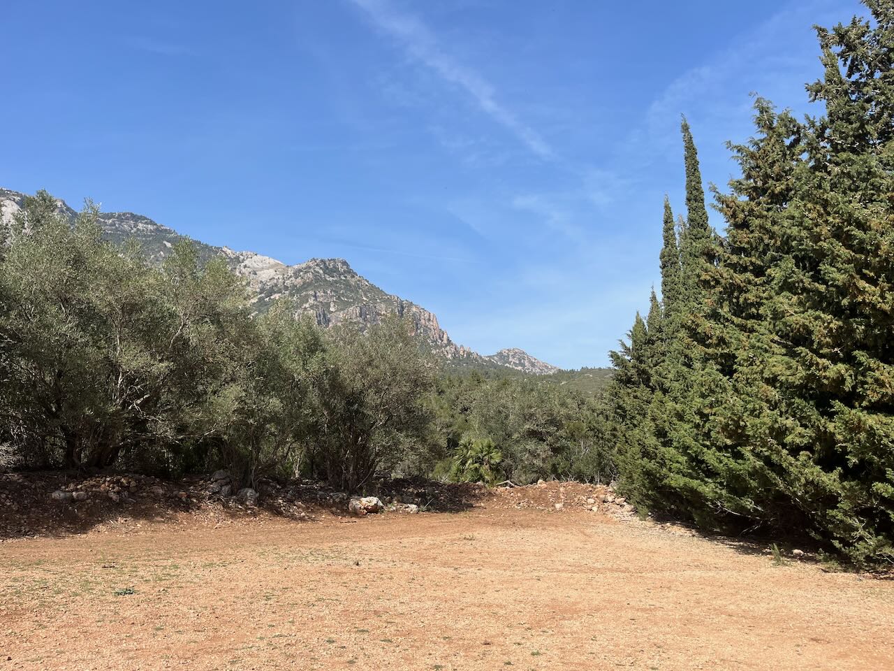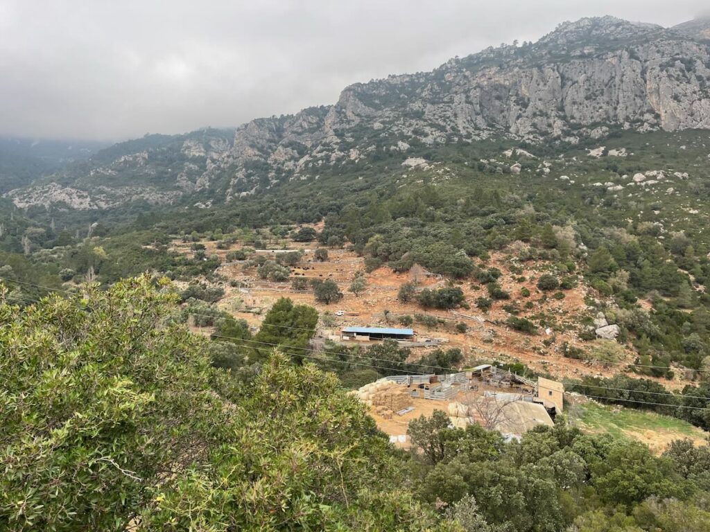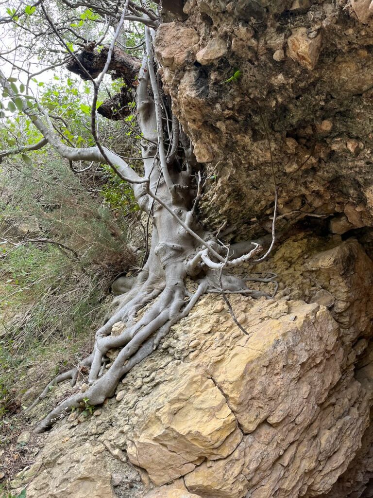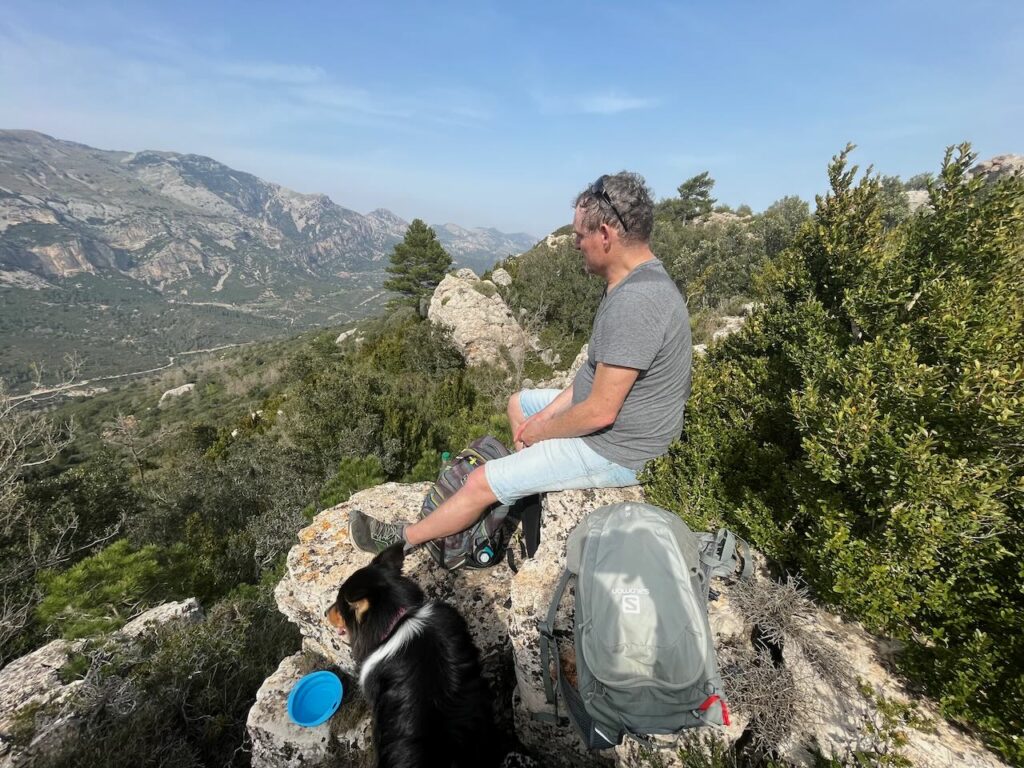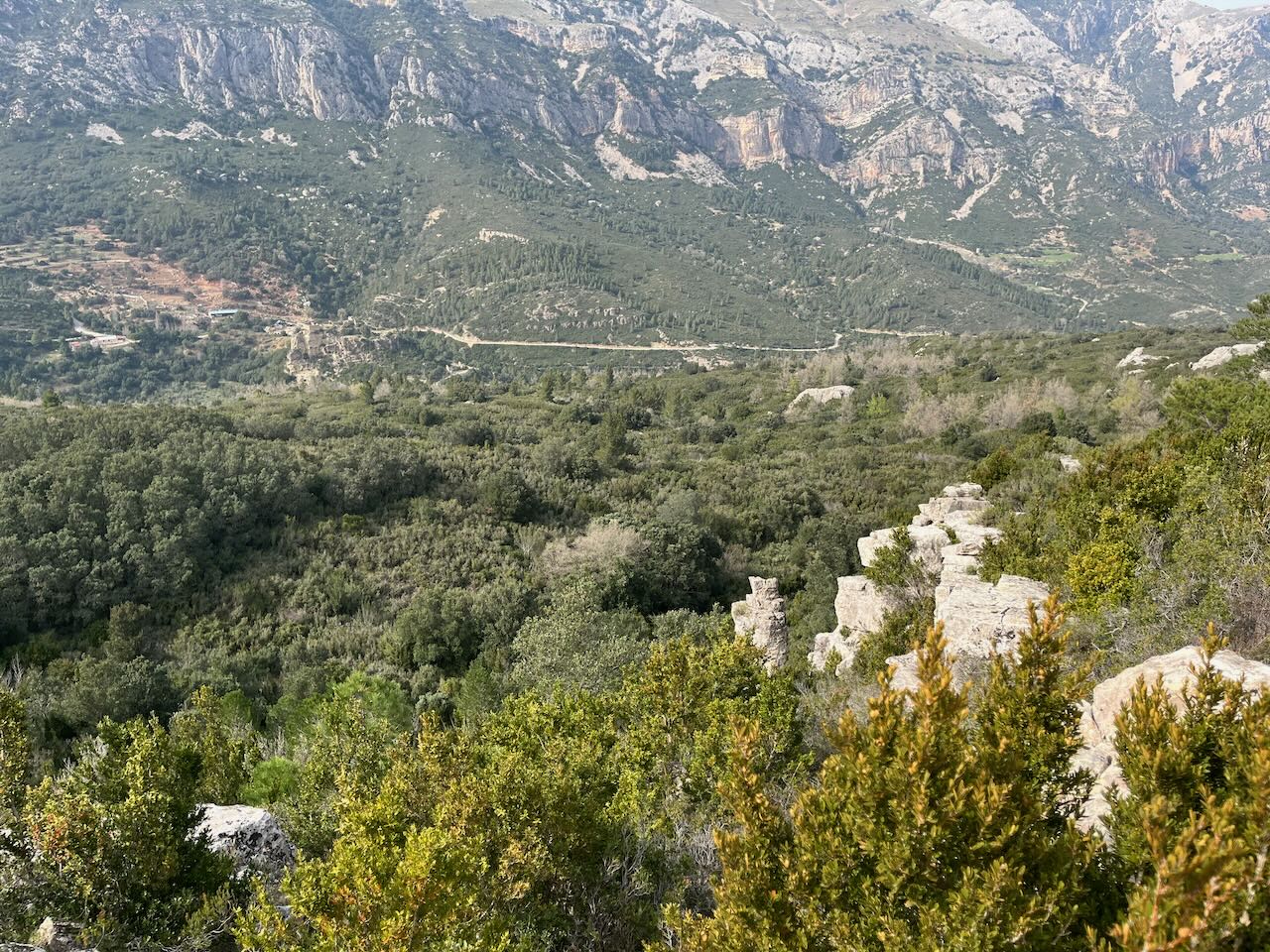Wir folgen dem Pfad weiter, er wird immer schmaler und immer stacheliger… boarrr.. meine Beine.. aber die Felsen sind total interessant, es sieht teilweise aus wie von Menschen gemacht, aber es sind doch nur natürliche Felswände, die da über einem aufragen. Und dann sind wir oben – an der Bergkuppe – und schauen tatsächlich rüber ins nächste Tal. Dort sieht man außer Macchie nur ein Haus – ansonsten scheint alles der Natur zu gehören. Irgendwo dort unten soll ein hübscher kleiner See, gespeist von einer Quelle, sein – El Toll Blau – aber das ist definitiv zu weit heute für uns. Wir hocken uns auf ein paar Steinplateaus, die wie Sitze geformt sind, und blicken runter in unser Tal. Krasser Blick. Wahnsinn.