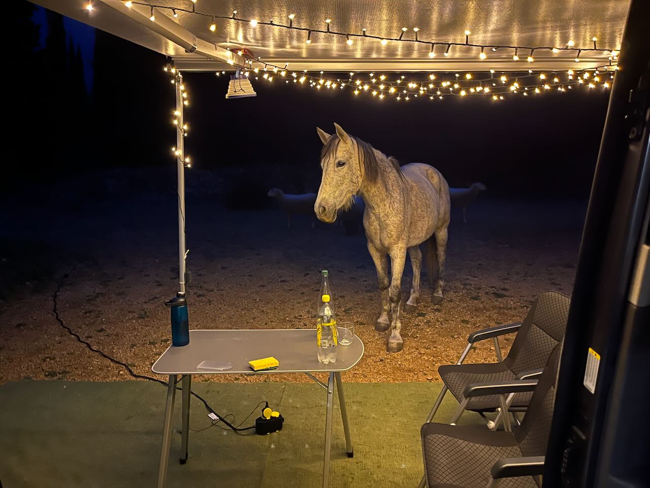 Am Abend kommt die Stute nochmal an unserem Platz vorbei – sie scheint es gewohnt zu sein, dass die Camper ihr etwas zu Fressen abgeben. Nope Süße, nicht bei uns. Ich kenn euch Kollegen viel zu gut, ihr werdet so unendlich penetrant, wenn man erstmal damit anfängt.