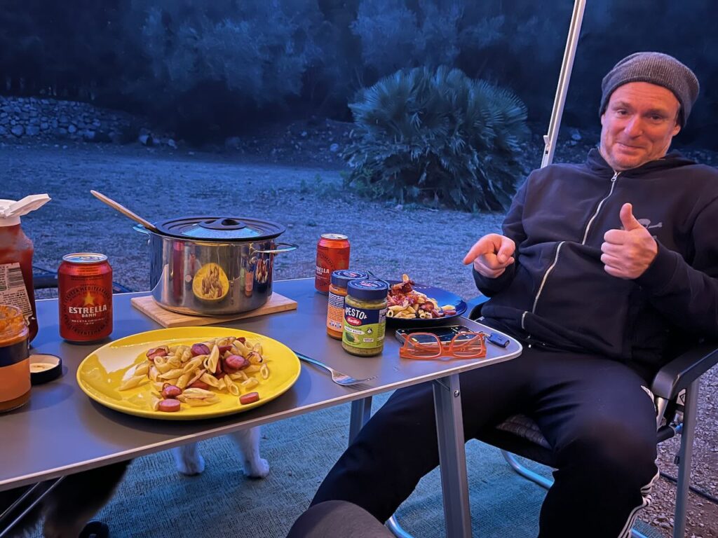 Was für eine schöne Wanderung! Olaf fährt noch in den Nachbarort und will etwas fürs Abendessen besorgen. Der kleine Tante-Emma-Laden im Dorf hat allerdings nicht viel zu bieten und so gibts Abendessen á la Pipi Langstrumpf – Nudeln mit Wurst und Ketchup 😂 (oder Pesto) – aber dazu wenigstens schön kühles Estrella-Bier.
