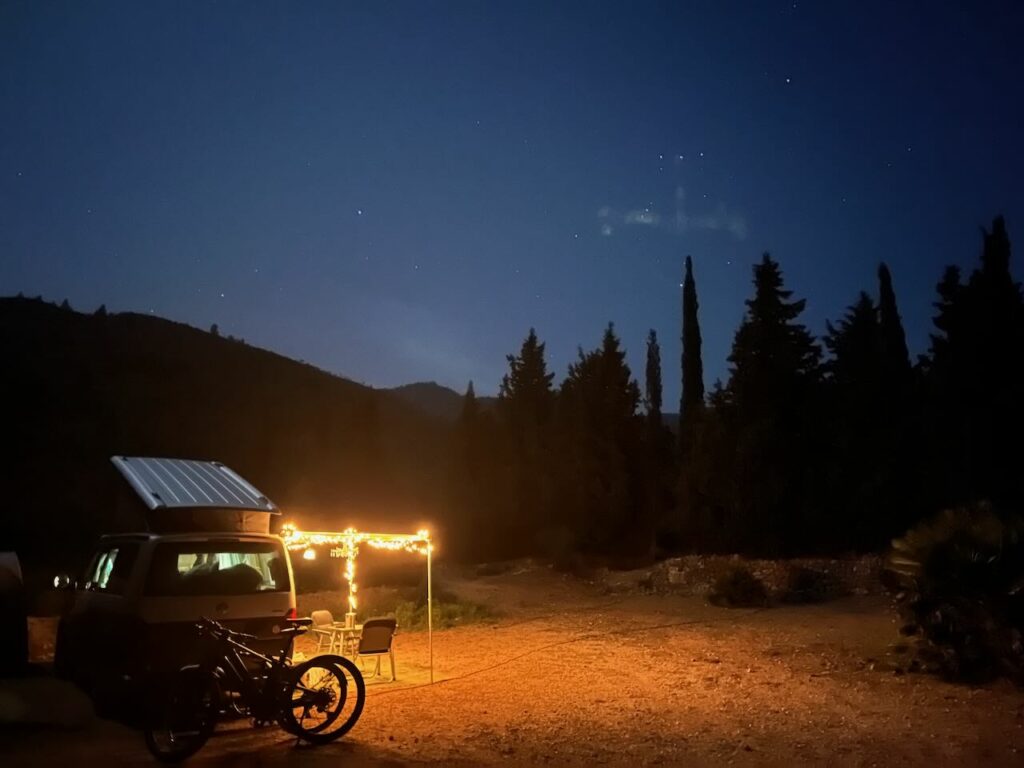 Später am Abend machte Olaf noch fix mit unserer neusten Errungenschaft – einem elektrischen Ceran-Kochfeld – den leckeren Auflauf im Topf warm. Seit der Explosion in A-Town haben wir eine recht gestörte Beziehung zu Gaskartuschen. Die im Bulli ist ok, aber sonst wollen wir keine mehr um uns herum haben. Also haben wir uns für das elektrische Ding entschieden, damit wir allen Stinkekram weiterhin draußen kochen können, ohne den Bulli für immer einzufetten und einzuräuchern.