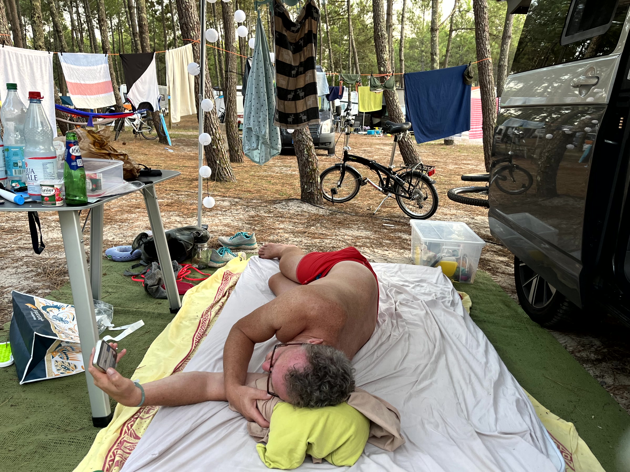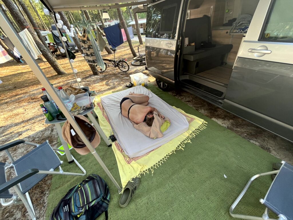 Auf den Tag mit 36 Grad am Campingplatz (31 am Strand) folgte eine Nacht mit einer niedrigsten Temperatur von 27 Grad – und absoluter Windstille. Als wir dann irgendwann zu müde waren, um draußen abzuwarten, dass es kühler wird (machte ja auch keinen Sinn), lagen wir mit offener Heckklappe, offener Schiebetür, offenen Fenstern und bei Olaf oben im Aufstelldach komplett offener Front im Bulli – und waren kurz vorm hecheln. Gina wäre mir in dieser Nacht eingegangen oder hätte ständig unter kalten, nassen Handtüchern liegen müssen, wäre sie nicht vor unserem Trip noch auf 3cm Felllänge geschoren worden.. ich war mal wieder SO FROH, dass ich das habe machen lassen, auch wenn ich tagelang hätte heulen können um das hübsche, lange Fell 😉