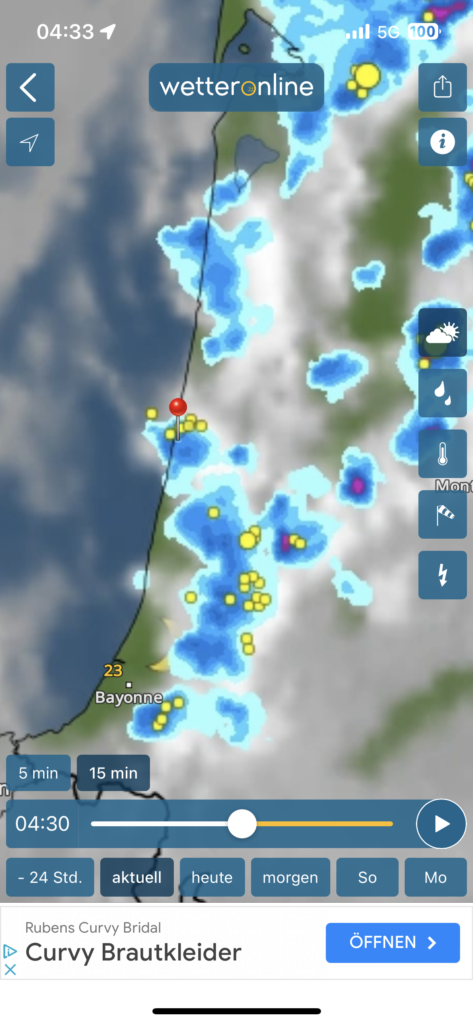 Puhhhh.. ok.. das erklärt einiges.. es ist allerdings keine Papierfabrik, sondern eine Terpentinfabrik. Immerhin, mit dieser Erklärung konnten wir endlich wieder beruhigt und soweit wie möglich bei 27 Grad weiterschlafen. Die Nacht blieb leider kurz, da das Thermometer schon früh in Richtung 30 Grad kletterte.. Aber am Abend dieses zweiten noch recht heißen Tages kam endlich ordentlicher Westwind auf, nachts zog ein ordentlich schepperndes Gewitter über uns hinweg und seitdem ist es merklich kühler und die Wellen auch wieder deutlich höher 😉