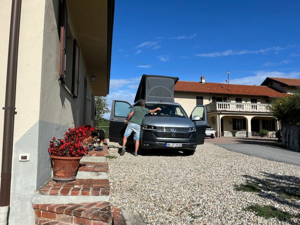 Der erste Treffer mit guten Bewertungen bei Google war das Ada Nada in der Nähe von Alba. Wir hatten spontan ein kleines Ferienhaus gebucht, das abseits vom Weingut, aber anscheinend direkt neben dem Haus der Eigentümer stand. Drum herum gab es viel Platz, einen Garten, ein hohes Carport, einen eigenen Pool. Wir hatten Waschmaschine und Staubsauger zur Verfügung und sogar einen Gartenschlauch. Perfekt für unser Vorhaben 😉