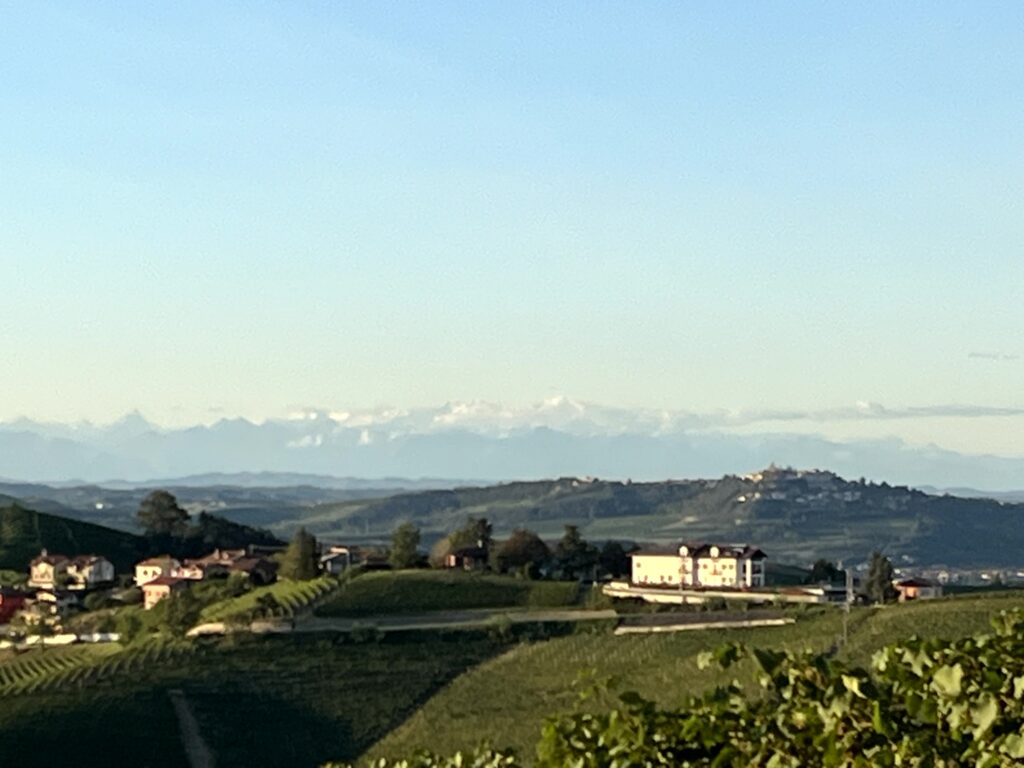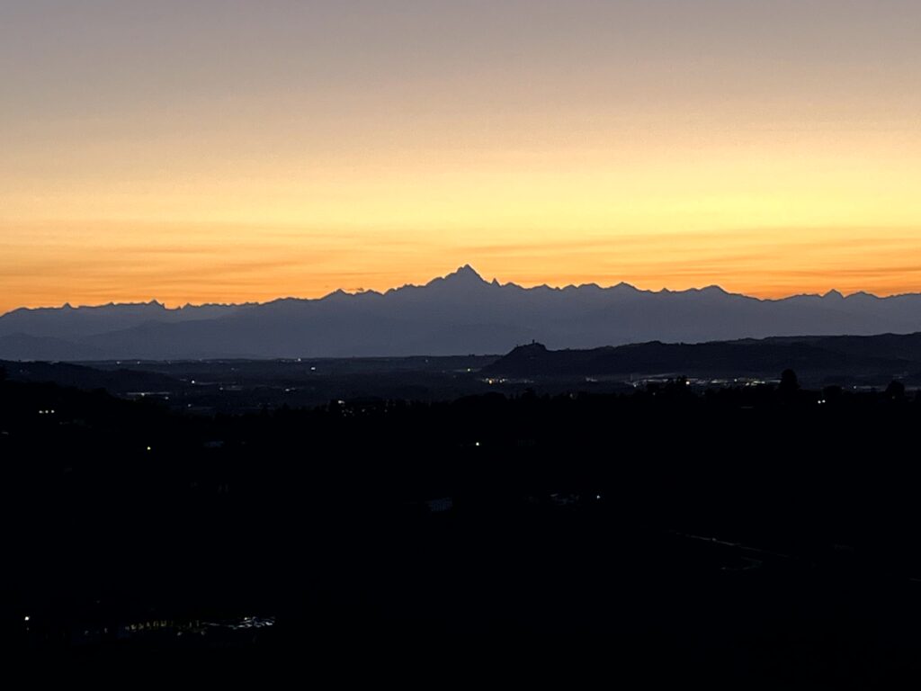 Und der Ausblick.. einfach Wahnsinn. Wir hatten von dort oben einen Rundumblick über die Weinhänge. Von Norden über Westen bis Süden lagen uns Täler und Hänge voller Weintrauben zu Füßen. Der Blick reichte natürlich auch weit genug, um die Seealpen einmal rund herum zu sehen. Hier eine Spitze mit 3800m Höhe, und weiter drüben im Nord-Westen war sogar der schneebedeckte Monte Rosa mit 4600m Höhe auszumachen. Wow.