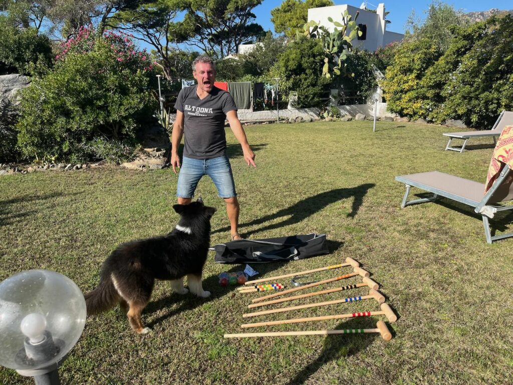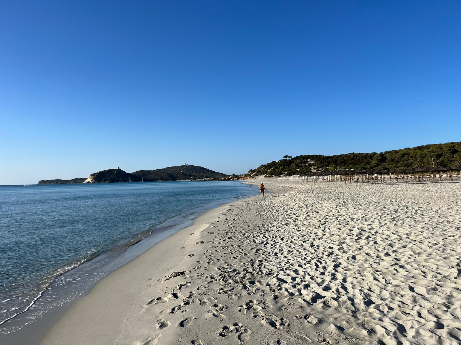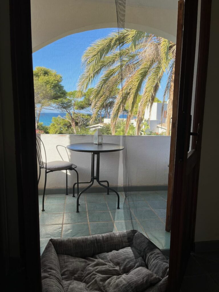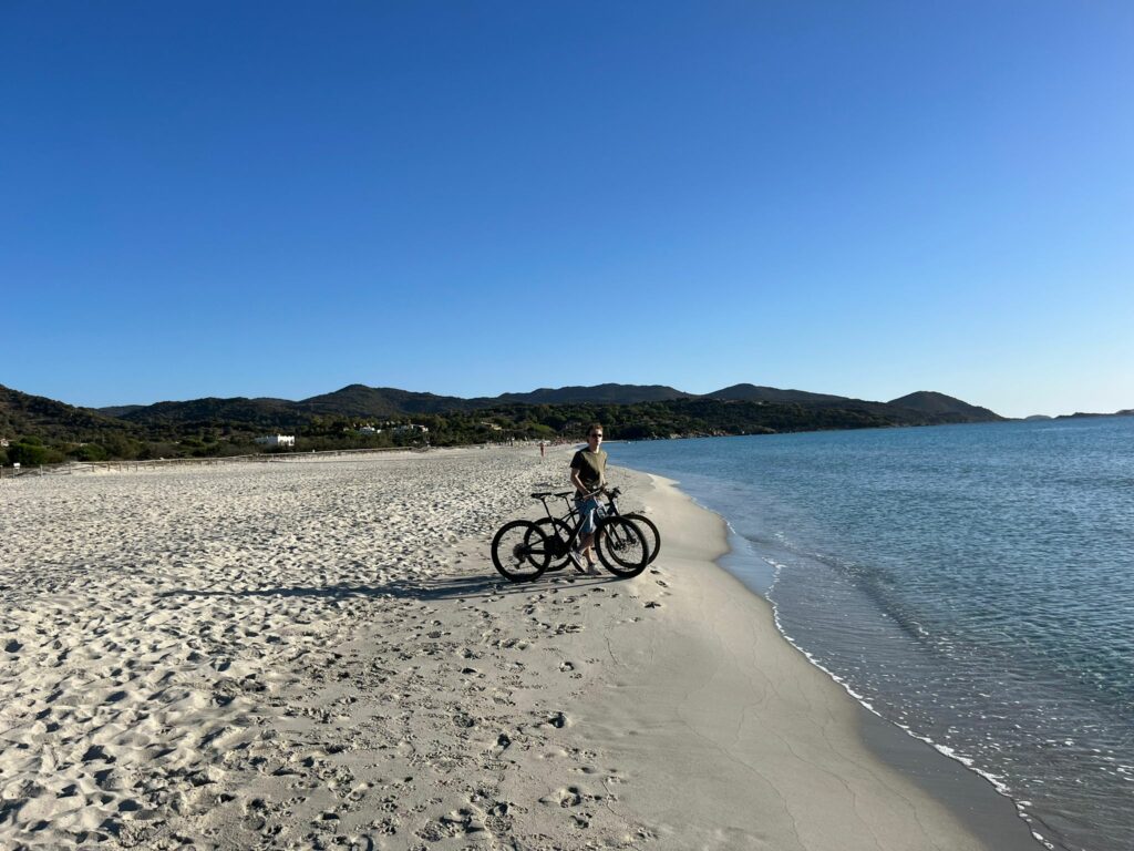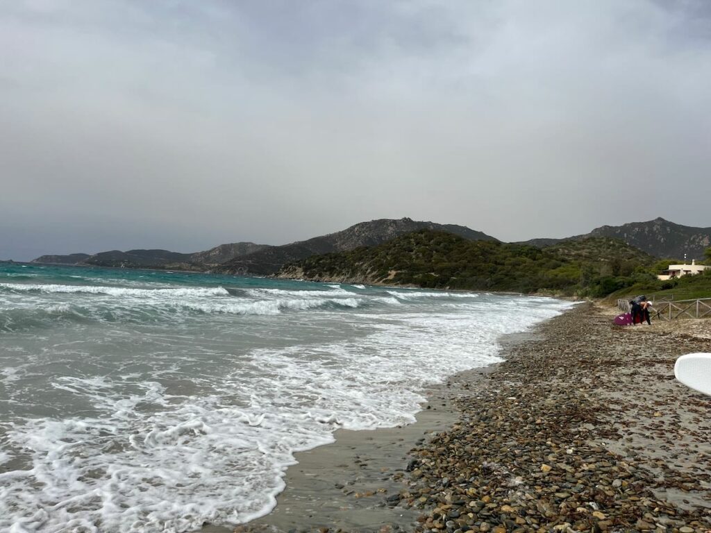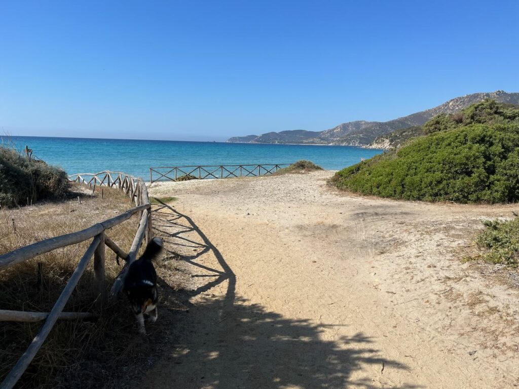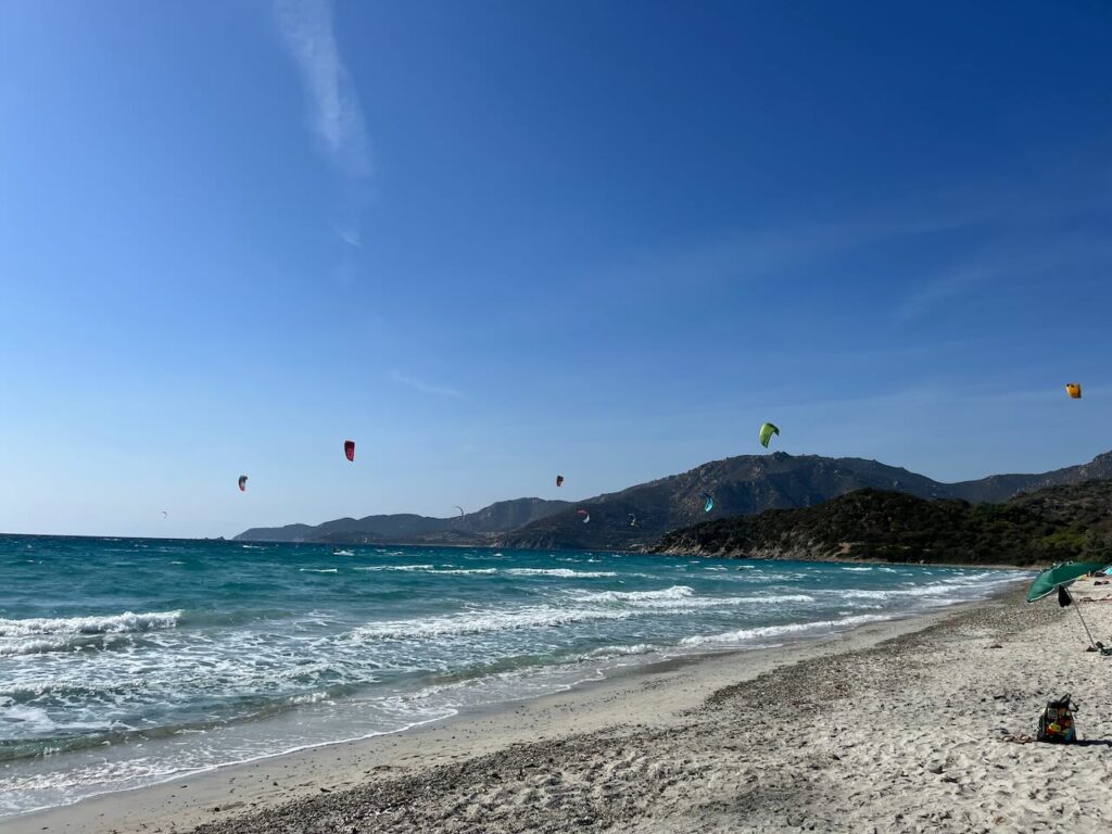 Den restlichen Tag verbrachten wir verteilt mit arbeiten und am Strand rumhängen. Nina und ich fuhren zu einer riesigen Bucht auf der Ost-Seite – Spiaggia di Porto Giunco (Google Maps Link). Mega schön, leider ziemlich voll und auch hier wieder – Wauwi-Verbot. Da wir aber schon Hunde in der Strandbar sahen, ignorierten wir das Schild wie üblich – es war auch wirklich klein und schwer zu lesen 😉