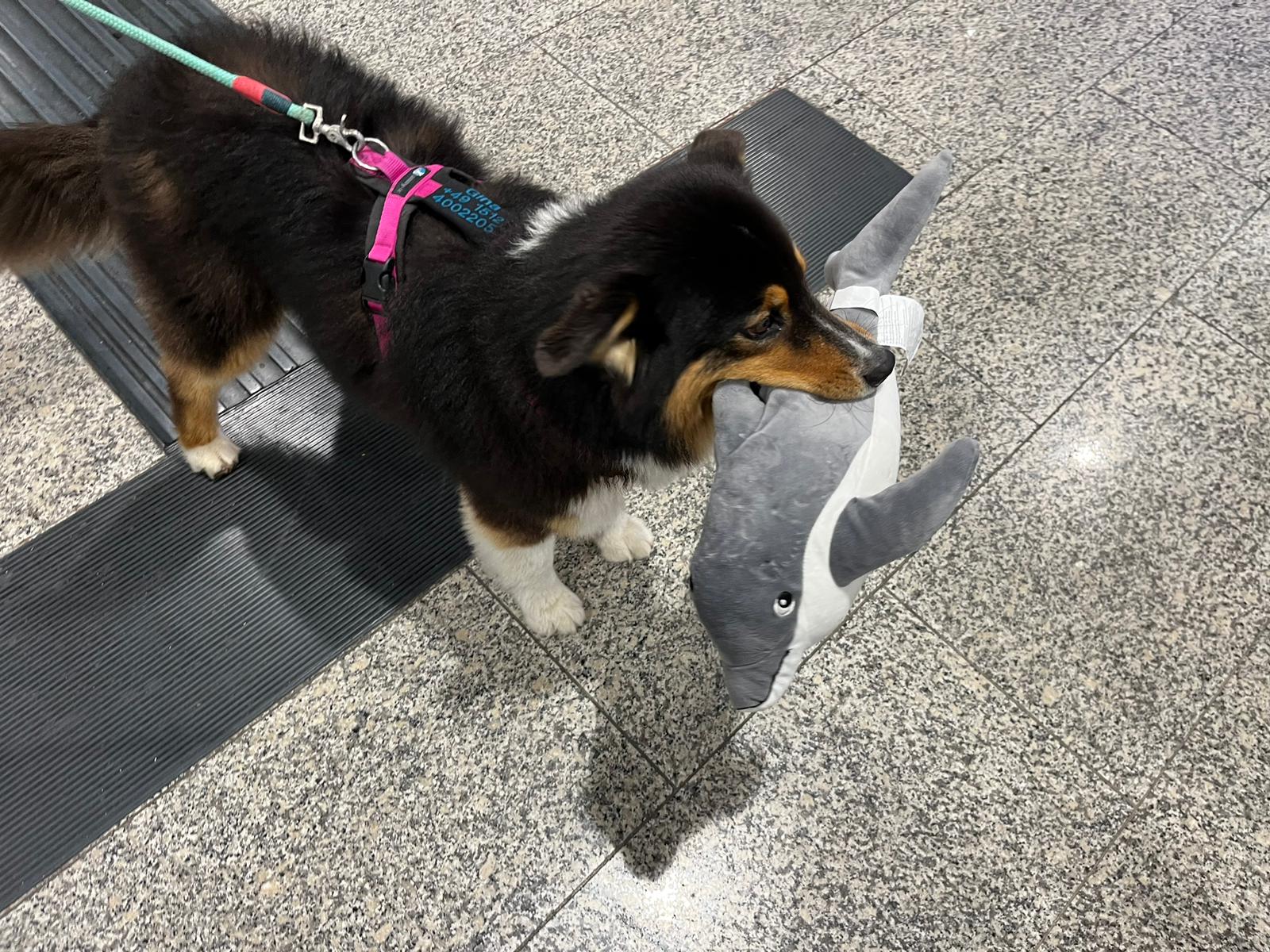 Aber fangen wir vorne an. Das Ninschn ist am Donnerstag Abend gelandet. Wir waren mit Gina am Flughafen und waren gespannt, wie sehr Gina die Ankunftshalle zusammenkreischen wird, wenn sie ihre Nina wiedersieht. Genauso war es auch – praktischerweise hatte Nina aber ein Kuscheltier – einen Delfin – Fini – für Gina dabei und ihn ihr direkt ins Maul gestopft und damit das freudige Gebell erstickt. Gina war selig und überglücklich, einerseits ihre Nina und andererseits ein tolles Spielzeug. Natürlich standen dem ganzen Flughafen die Herzchen in den Augen, als sie Gina mit Fini im Maul rumlaufen sahen.